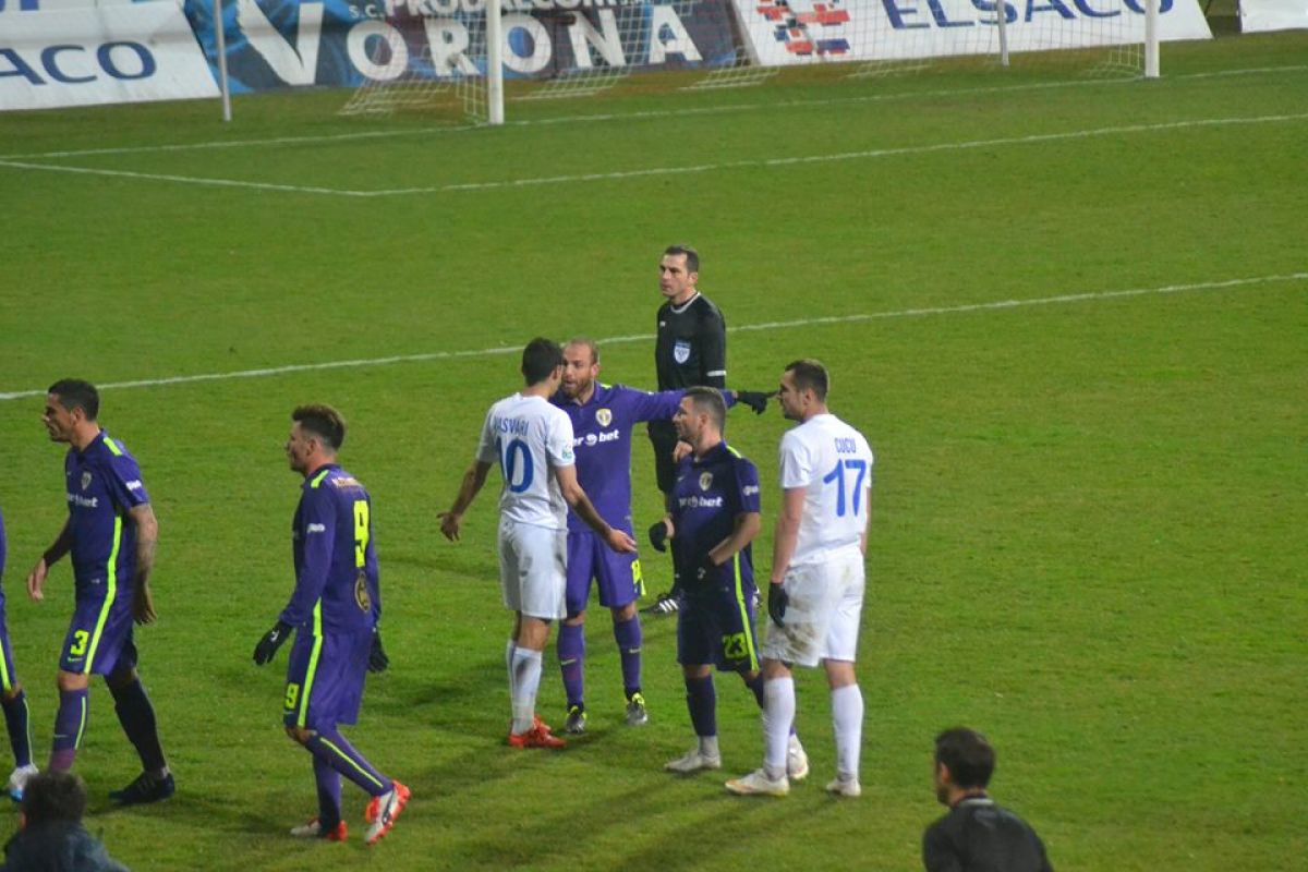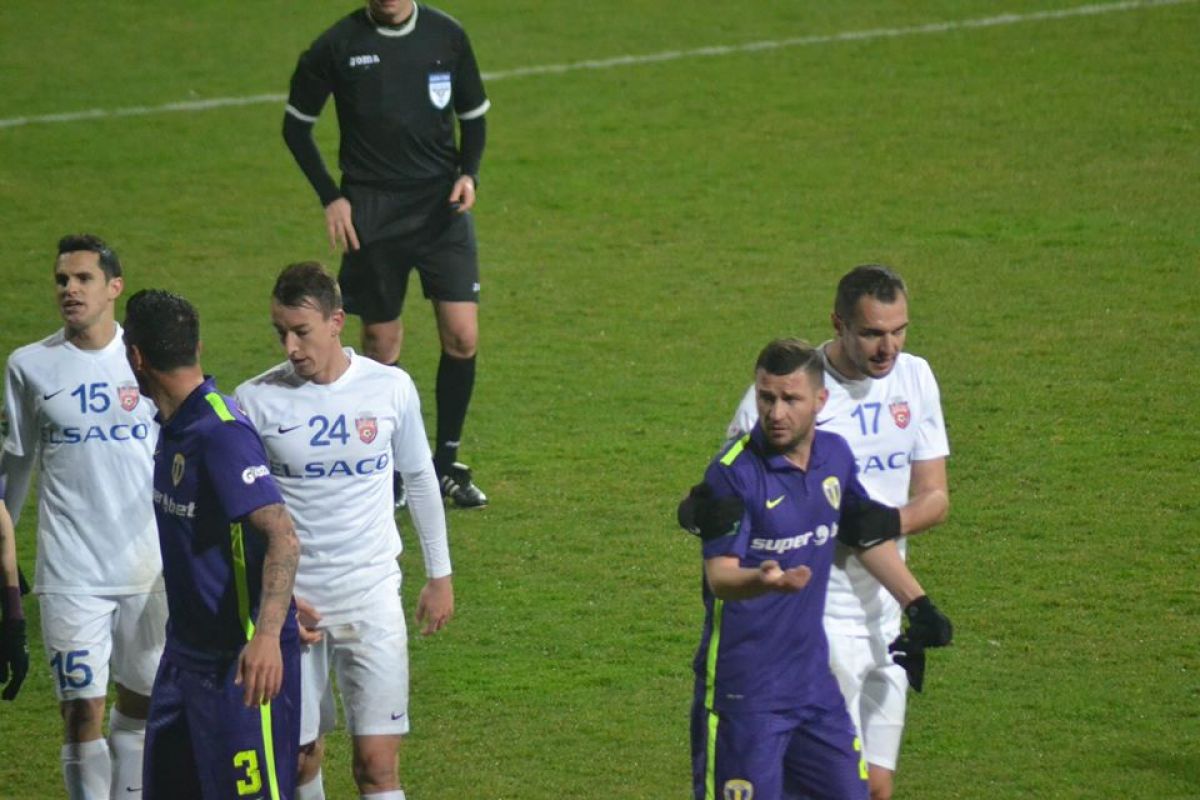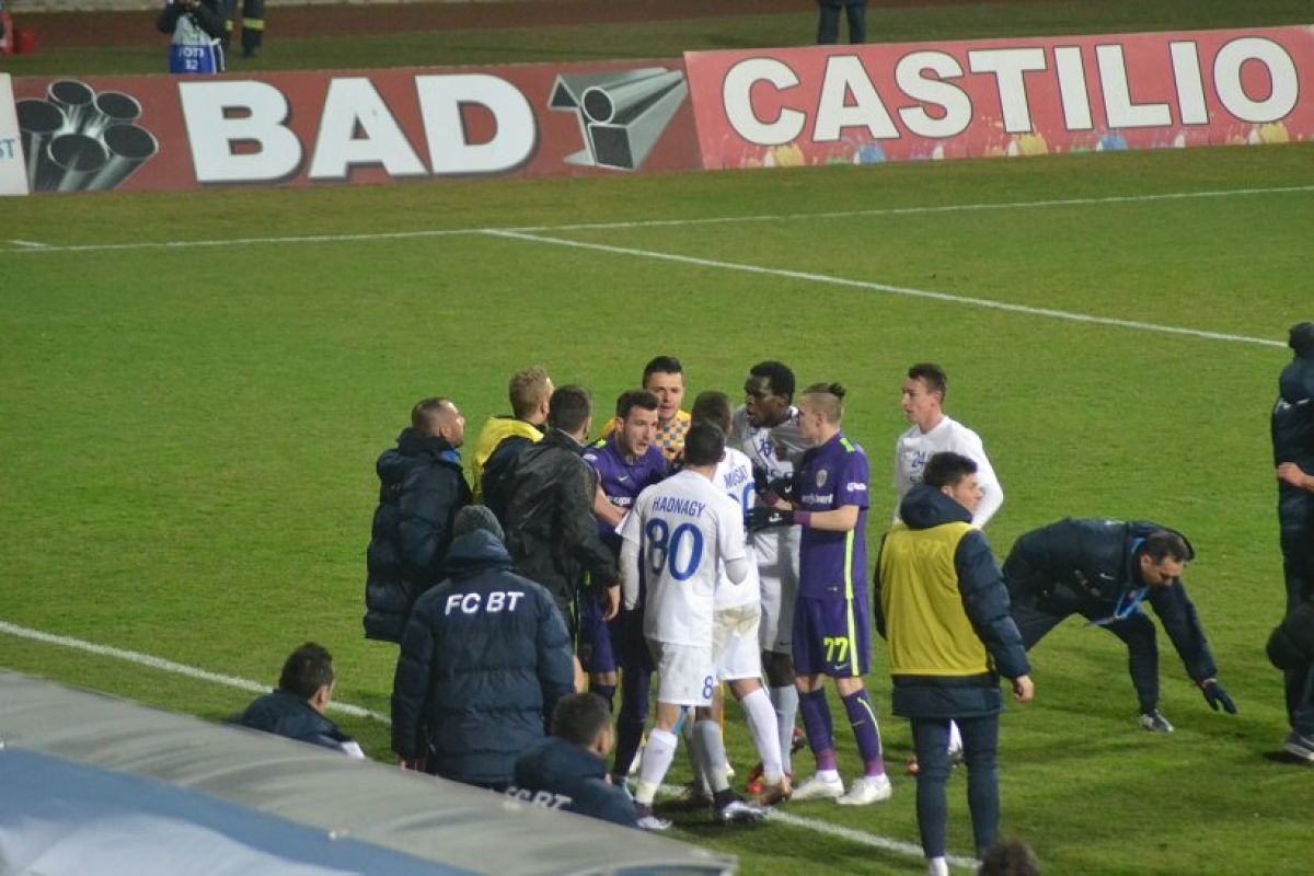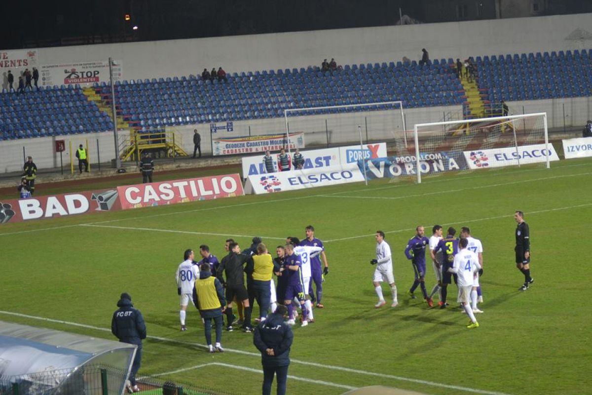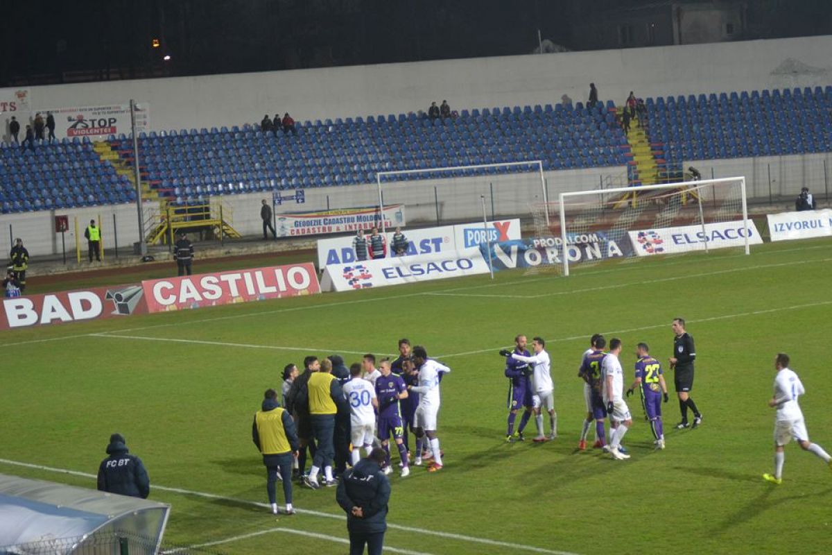 Veteranul Attila Hadnagy a avut câteva reproșuri să-i adreseze lui Daniel Stana și de acolo s-a ajuns la o îmbulzeală generală între cele două echipe.Totul s-a petrecut în fața băncii tehnice a echipei gazdă. Jucătorii au început să se împingă și să-și strige tot felul de cuvinte. Arbitrul central și tușierul au intervenit pentru liniștirea spiritelor. Au sărit de pe bancă și cei aflați în staff-ul tehnic al lui Cristi Pustai. Partida este una încrâncenată, se joacă dur dar fără finalizare iar în primele 45 de minute s-au înregistrat două faze controversate și cartonașe galbene împărțite cu dărnicie. (G.E.)