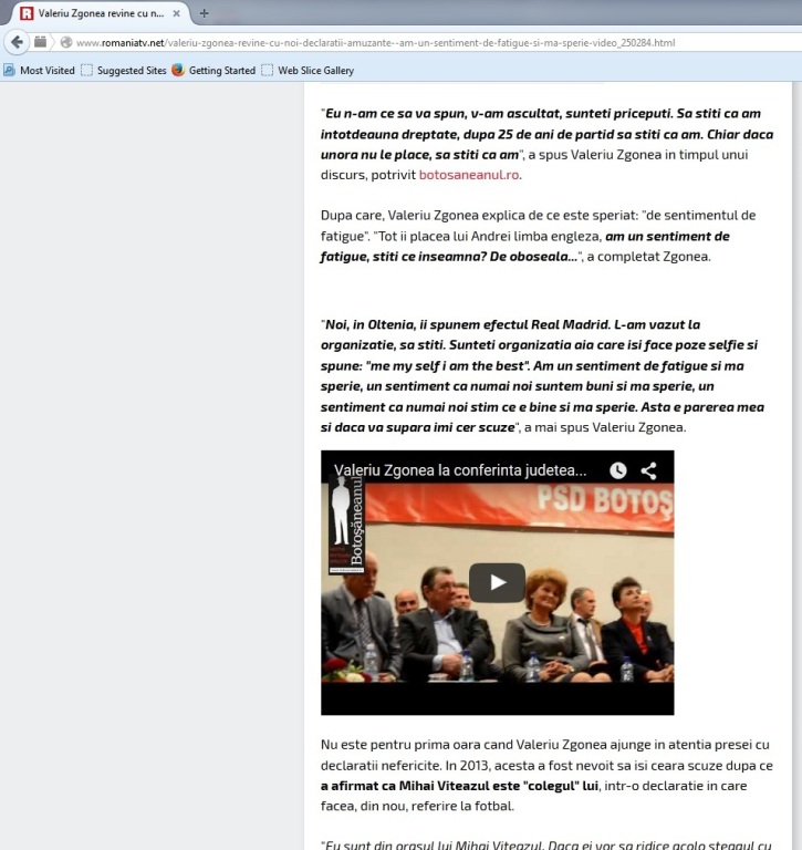 "Eu n-am ce să vă spun. V-am ascultat, sunteţi pricepuţi. Să ştiţi că am întotdeauna dreptate, după 25 de ani de partid să ştiţi că am. Chiar dacă unora nu le place, să ştiţi că am. Tot îi plăcea lui Andrei limba engleză - am un sentiment de fatigue. Ştiţi ce înseamnă? De oboseală... Noi, în Oltenia, îi spunem efectul Real Madrid. L-am văzut la organizaţie, să ştiţi. Sunteţi organizaţia aia care îşi face poze selfie şi spune: «me my self, i'm the best.» Numai eu. Am un sentiment de fatigue şi mă sperie, un sentiment că numai noi suntem buni şi mă sperie, un sentiment că numai noi ştim ce e bine şi mă sperie. Asta e părerea mea şi dacă vă supără îmi cer scuze", a spus preşedintele Camerei Deputaţilor, Valeriu Zgonea, potrivit înregistrării difuzate de cotidianul local Botosaneanul.ro – scrie Mediafax.