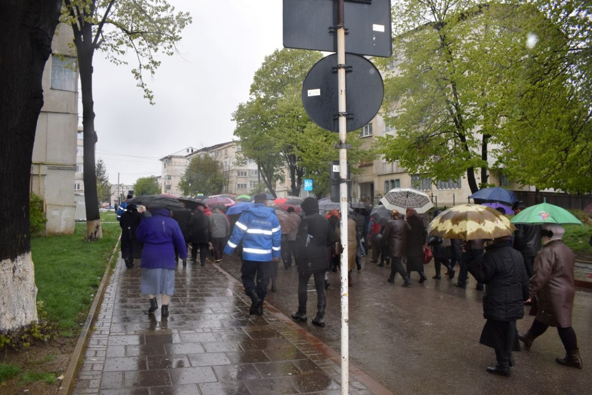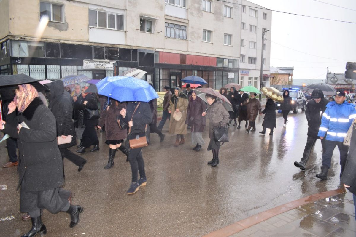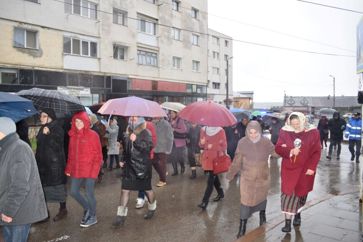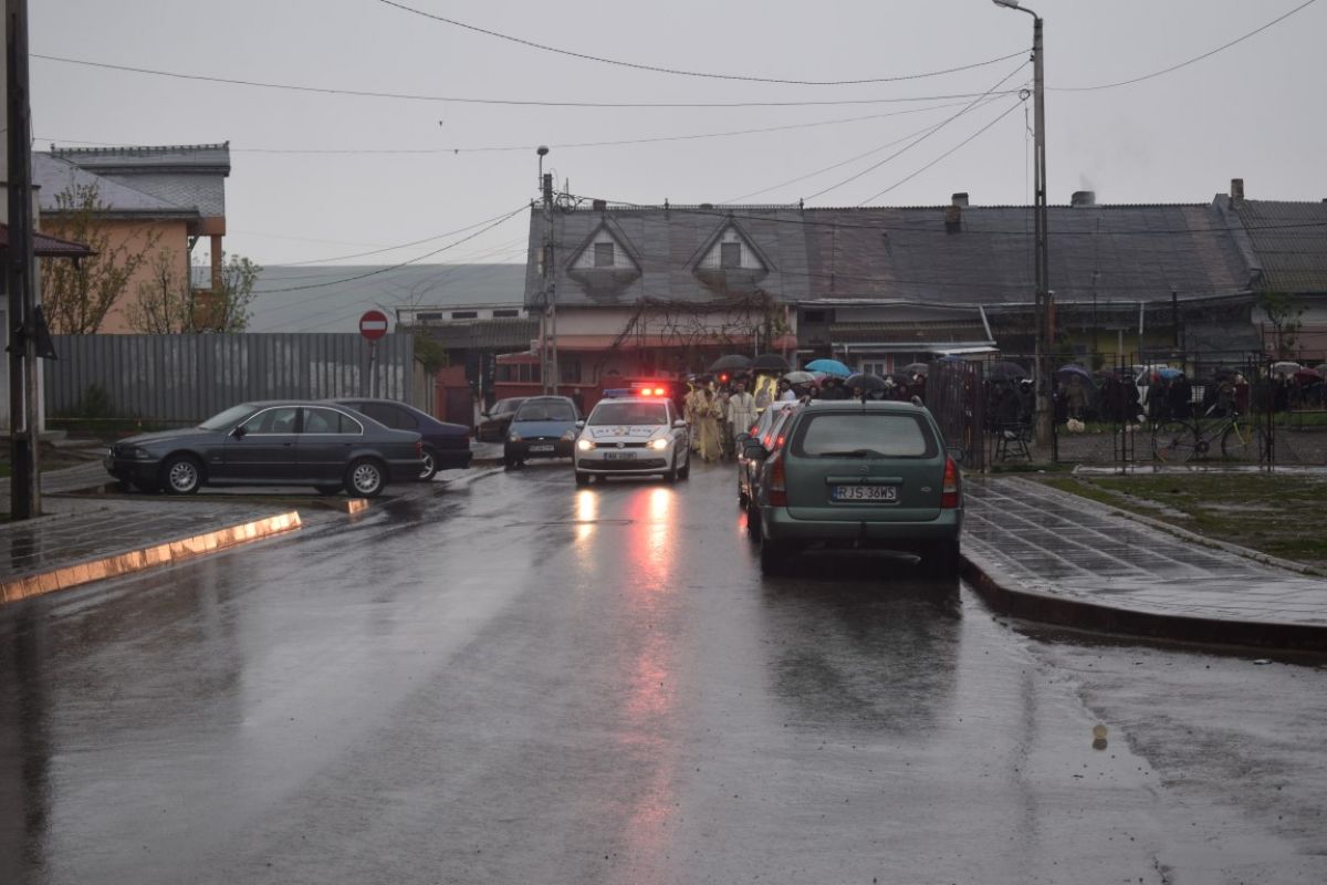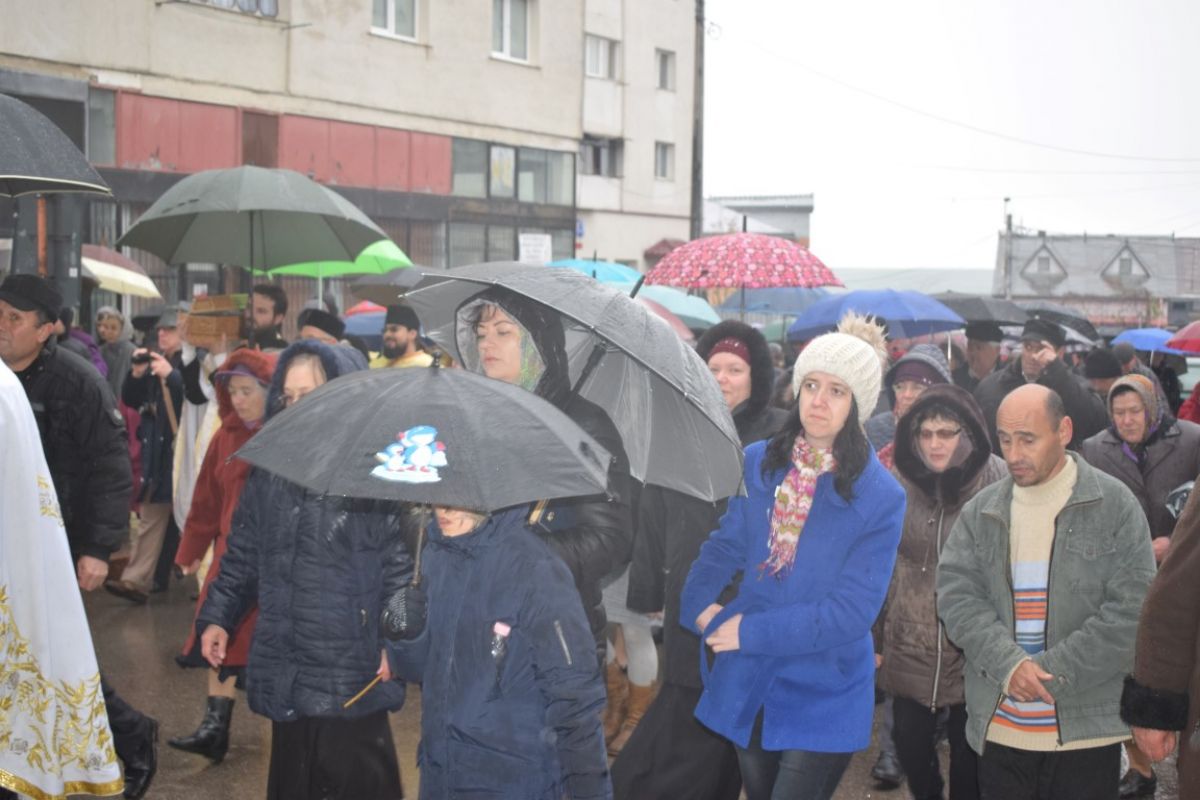 Cu pas grăbit și ascunși sub umbrele și glugi, credincioșii au parcurs în mai puțin de o oră traseul Parcul Tineretului, Strada Săvenilor, Aleea Parcul Tineretului, Strada Parcul Tineretului şi Biserică.