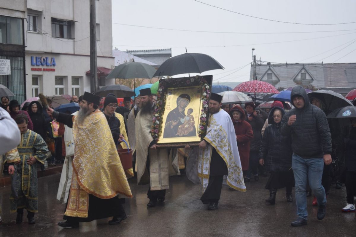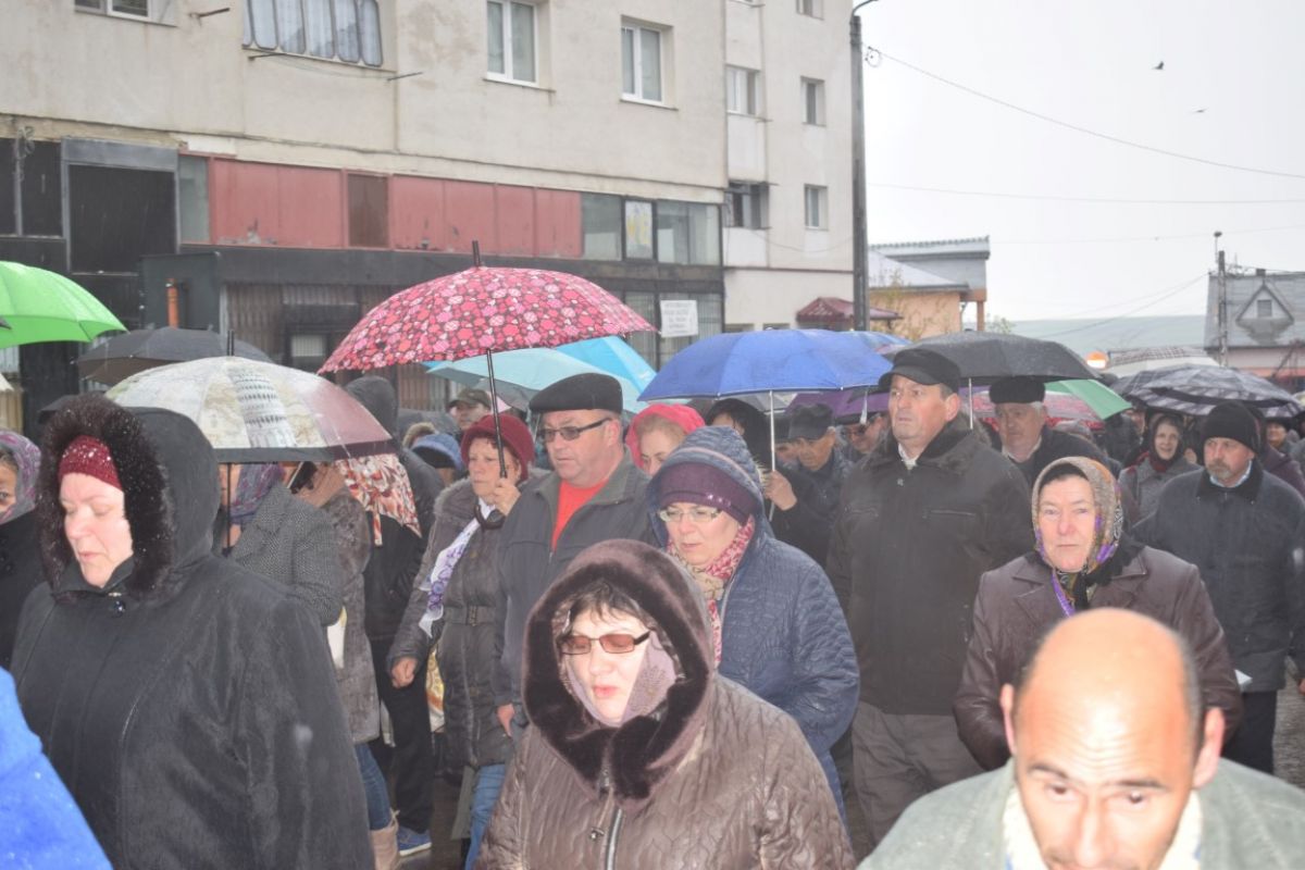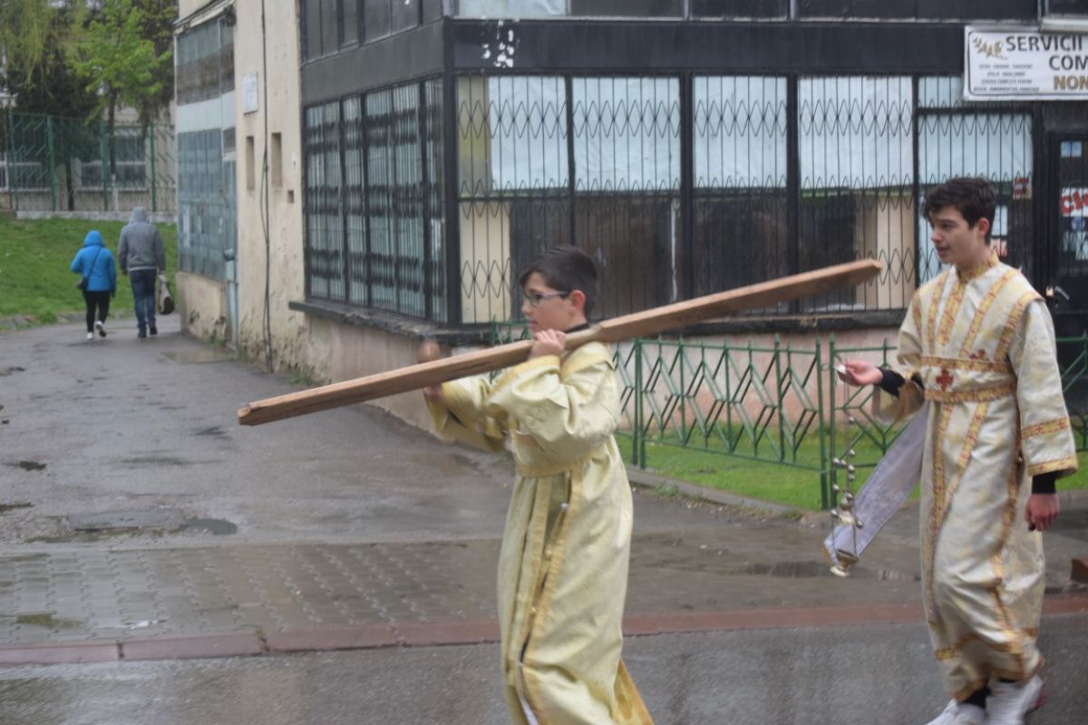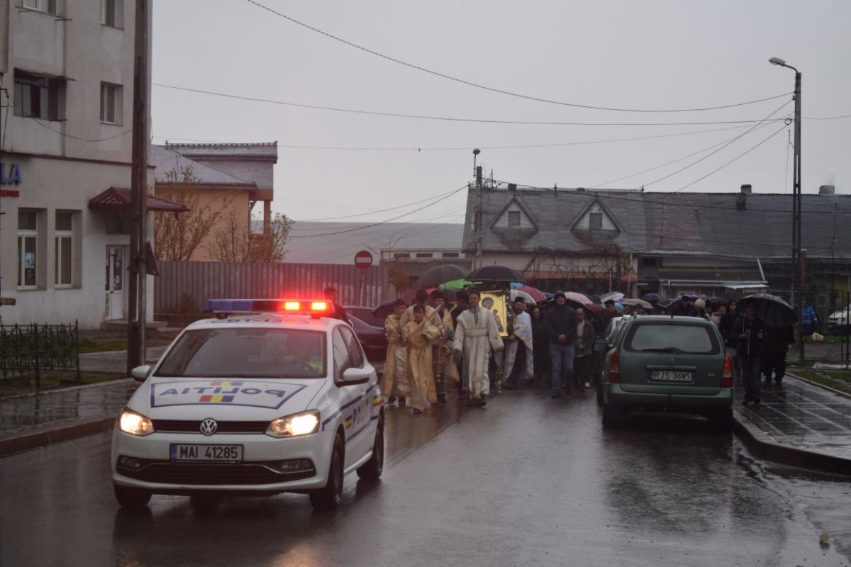 Cu pas grăbit și ascunși sub umbrele și glugi, credincioșii au parcurs în mai puțin de o oră traseul Parcul Tineretului, Strada Săvenilor, Aleea Parcul Tineretului, Strada Parcul Tineretului şi Biserică.