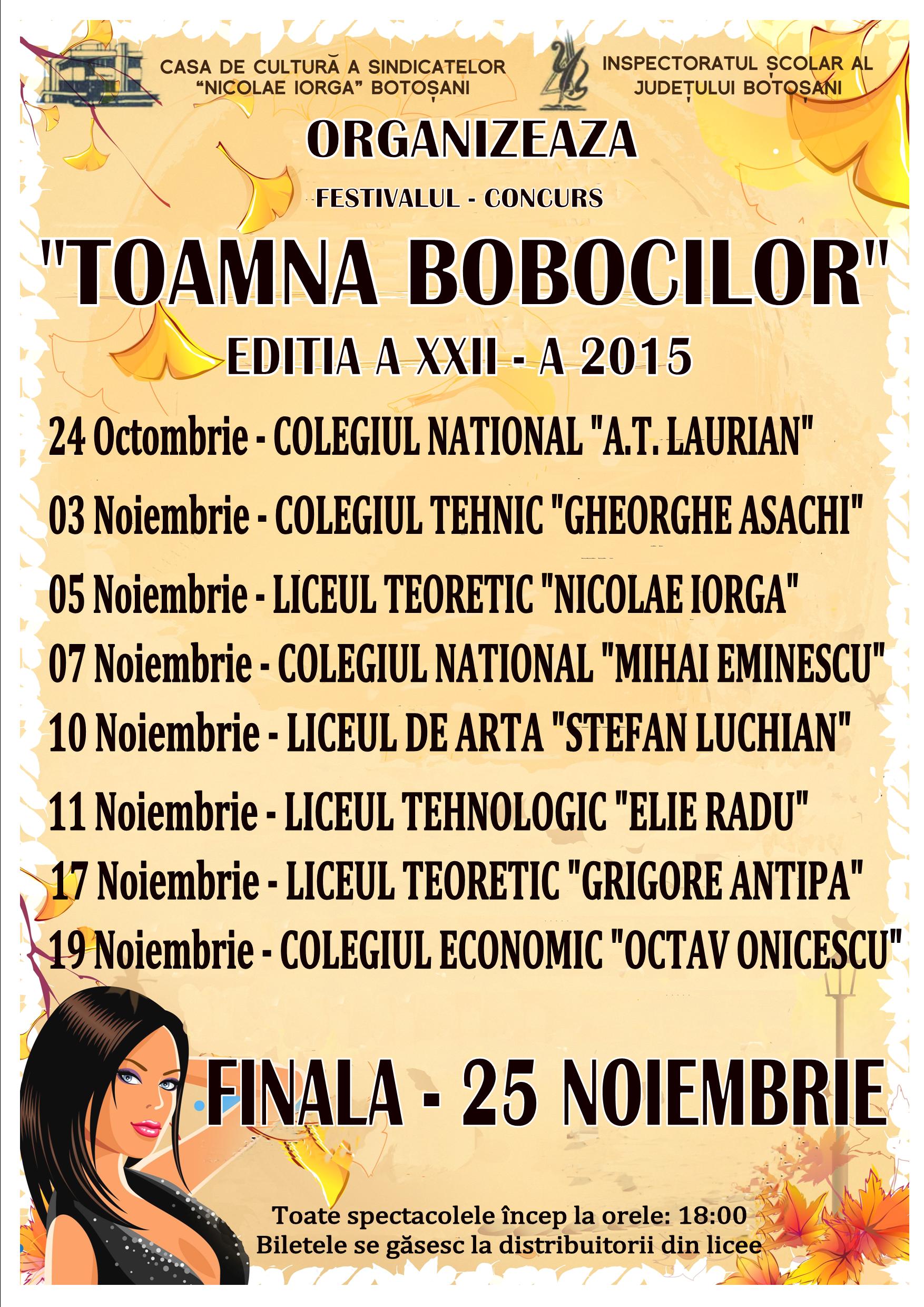 Casa de Cultură a Sindicatelor ”Nicolae Iorga” va găzdui la sfârșitul lunii acesteia festivalul – concurs intitulat ”Toamna Bobocilor”, eveniment organizat de la an, la an, care a premiat cele mai frumoase fete din oraș.