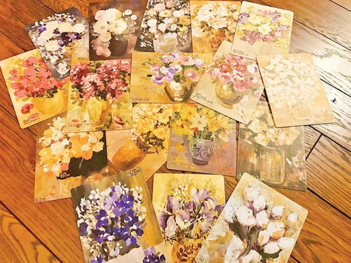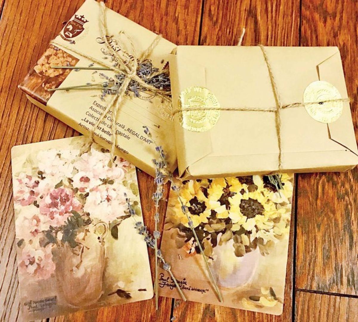 Pachetele de cărţi poştale conţin şi un hrisov unic, hârtie veche, sfoară, levănţică şi elemente de identificare din tablouri, alături de numele artistului.