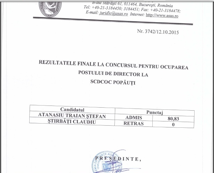 Vineri a avut loc ultima etapă din concurs iar marți, pe pagina electronică a Academiei de Științe Agricole ”Gheorghe Ionescu Șișești” a fost publicat rezultatul. Câștigător și cel care va ocupa funcția de director la Stațiunea Popăuți de la Botoșani a fost declarat Traian Ștefan Atanasiu, cu 80 de puncte adunate. Contracandidatul său s-a retras. Noul șef al stațiunii a ocupat în trecut un post similar la o structură din Bacău. (G.E.)