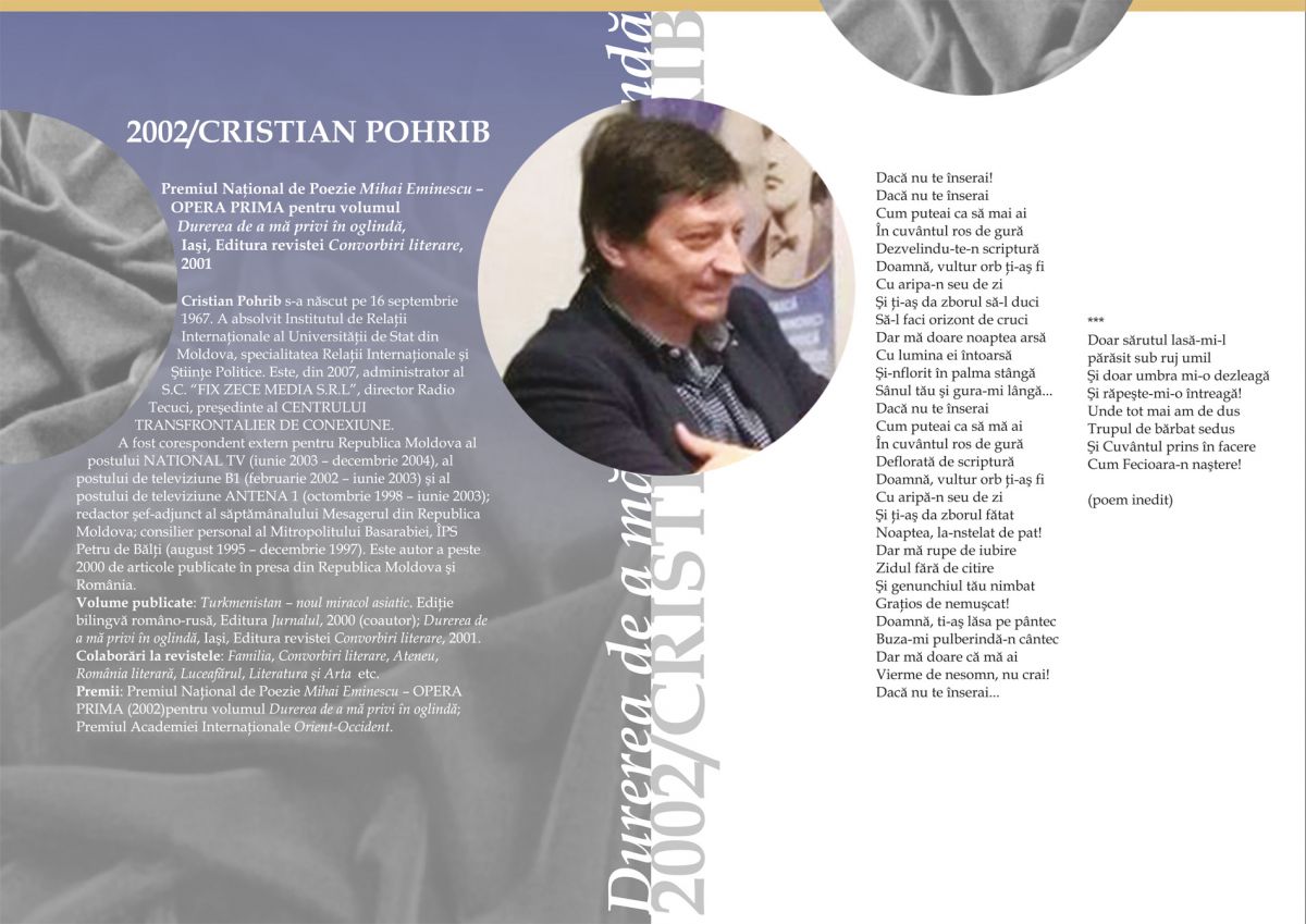 Laureat al Premiului Național de Poezie „Mihai Eminescu” – OPUS PRIMUM (2002), Cristian Pohrib s-a născut pe 16 septembrie 1967.