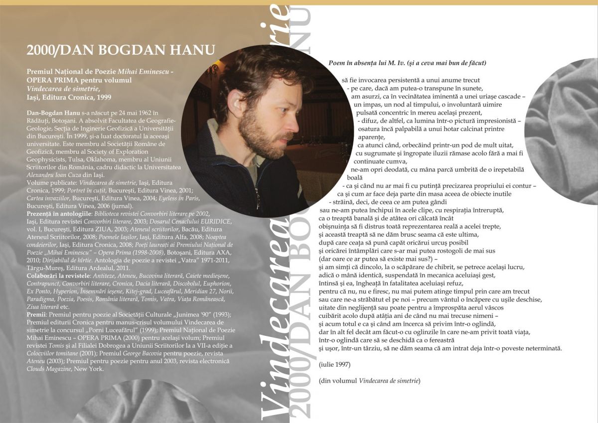 Memorialul Ipotești – Centrul Național de Studii Mihai Eminescu își propune, într-un parteneriat media cu ziarul Botoșăneanul, să prezinte, în ediția de duminică a rubricii GALERIA CU POEȚI, câte un laureat al Premiului Național de Poezie Mihai Eminescu – Opus Primum.