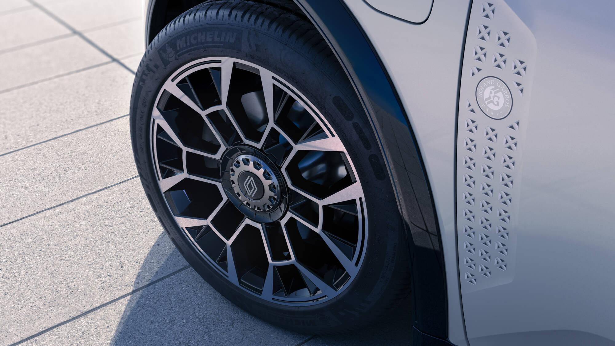 Seria specială Roland-Garros a Renault 5 E-Tech electric are un design elegant și sportiv. Sunt disponibile patru culori pentru caroserie: pearl white, midnight blue, starry black și o nuanță specială, matt slate grey. Aceste culori se potrivesc perfect cu ornamentele cromate cu finisaj satinat de pe conturul plafonului și cu jantele negre-lucioase de 18 inch în formă de diamant. Jantele cu design special adaugă o notă suplimentară de eleganță printr-un capac ornament roată într-o nuanță mată - slate grey.