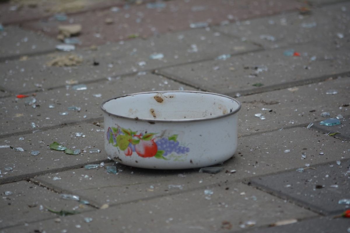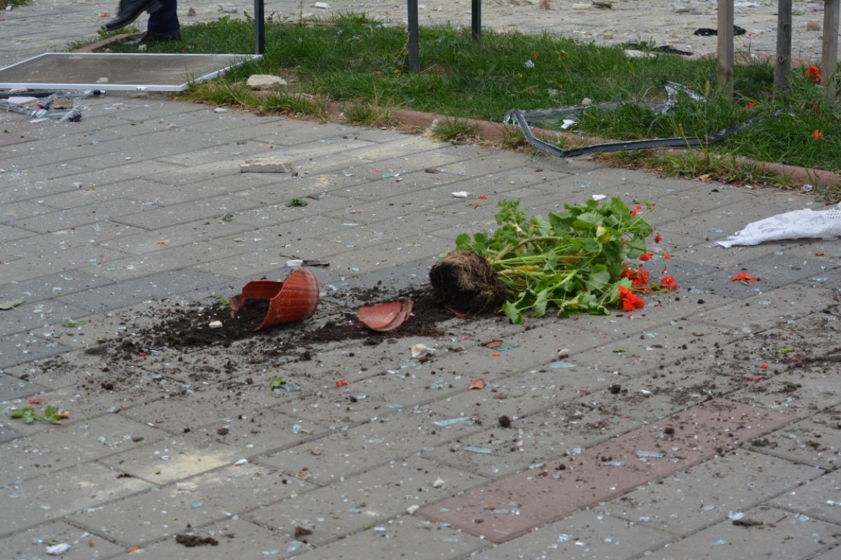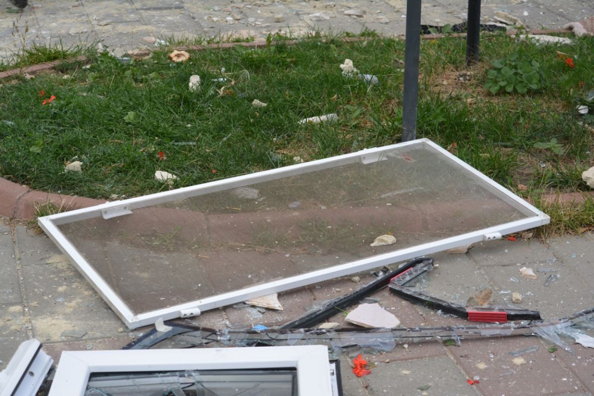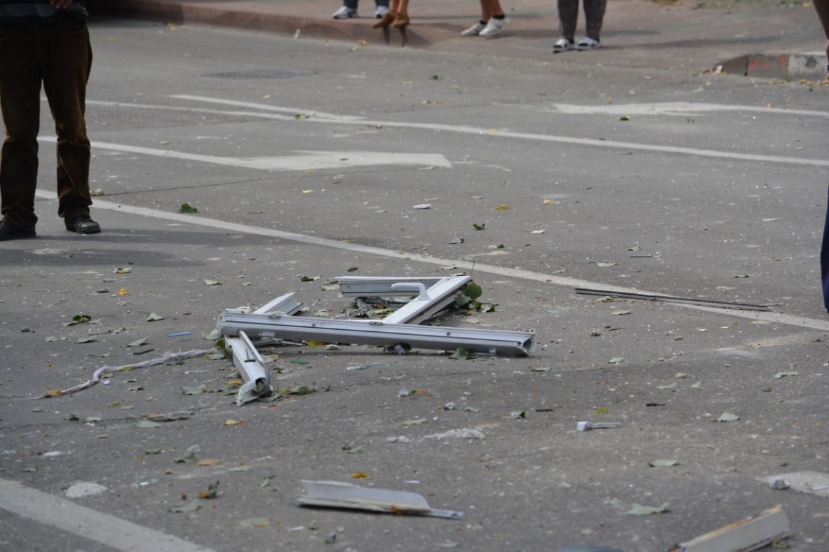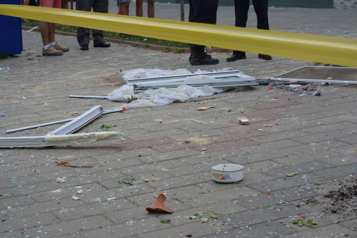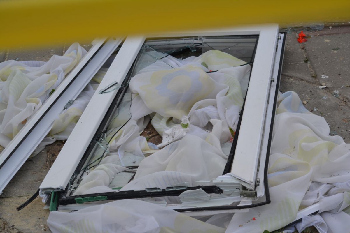 Pe trotuarul de sub balcon pot fi văzute, pe lângă bucăţi de ferestre, ghivece de flori, perdele, oale.