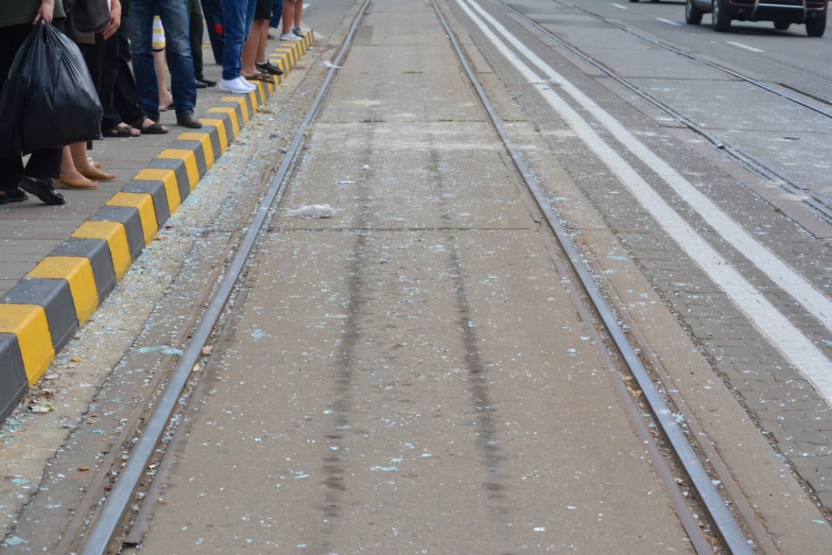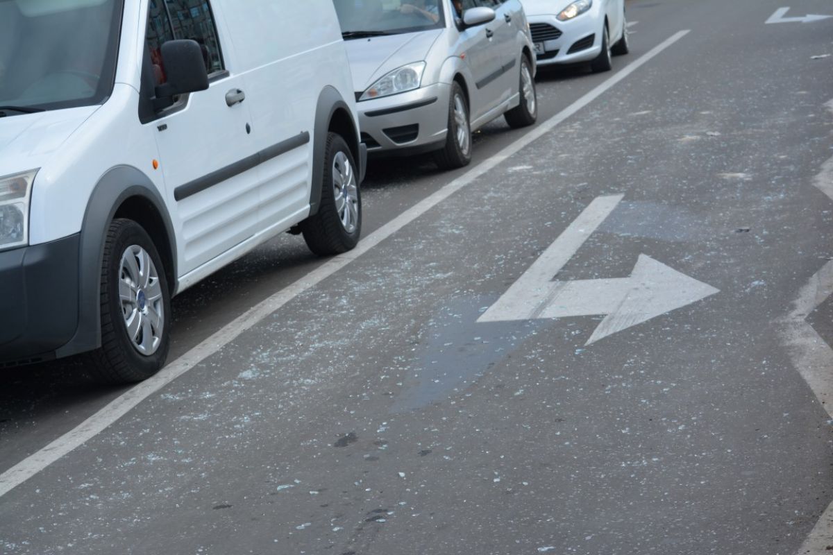 Pe ambele străzi, chiar şi pe trotuarelele aferente celuilalt sens de mers, au ajuns bucăţi de sticlă şi termpoane.