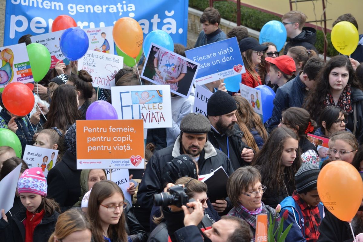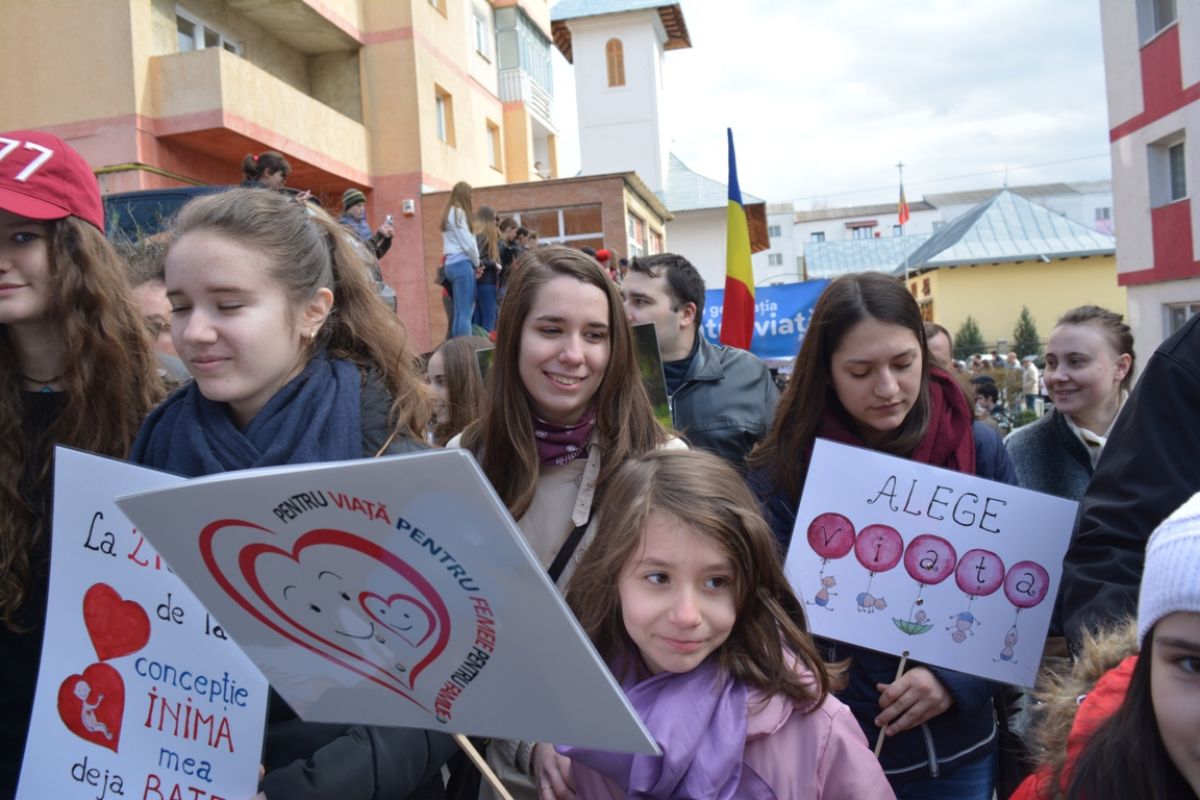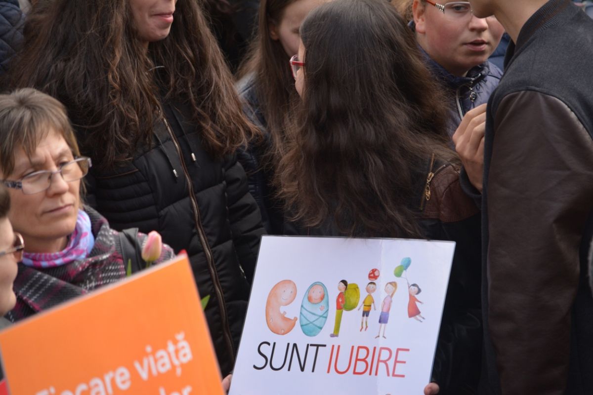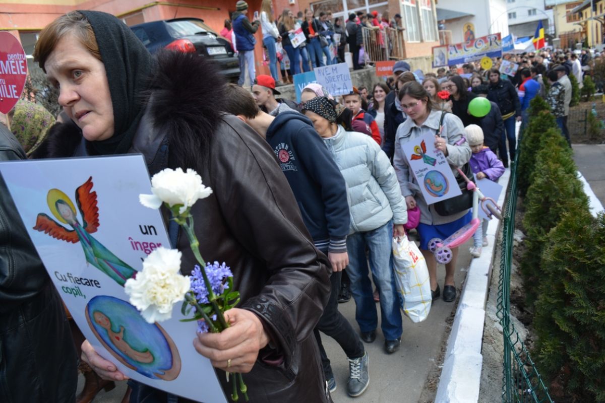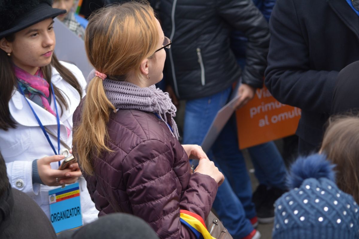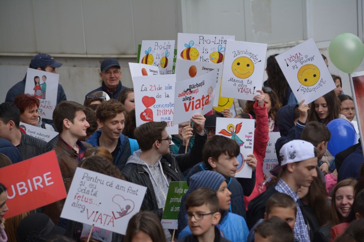Părinți și copii, tineri și bătrâni, profesori și elevi, femei și bărbați, undeva la 2.000 de oameni - după ce erau aproximativ 1.000 cu câteva minute înainte de ora 14:00, cea oficială a acțiunii - s-au strâns sâmbătă la amiază la Biserica Buna Vestire pentru a milita împotriva întreruperii sarcinilor.
