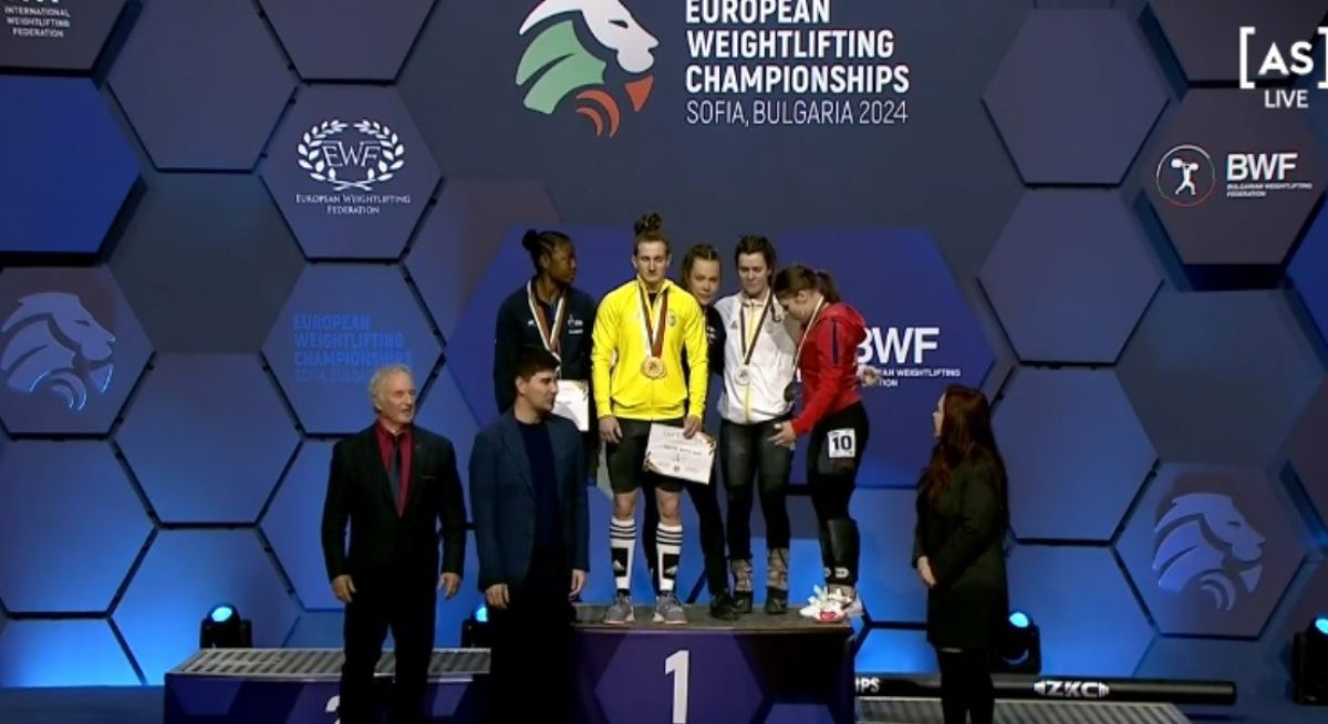 Scena a fost surprinsă la festivitatea de premiere a probei de 59 de kilograme de la Campionatele Europene de haltere.
