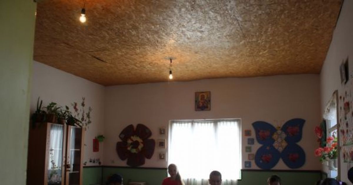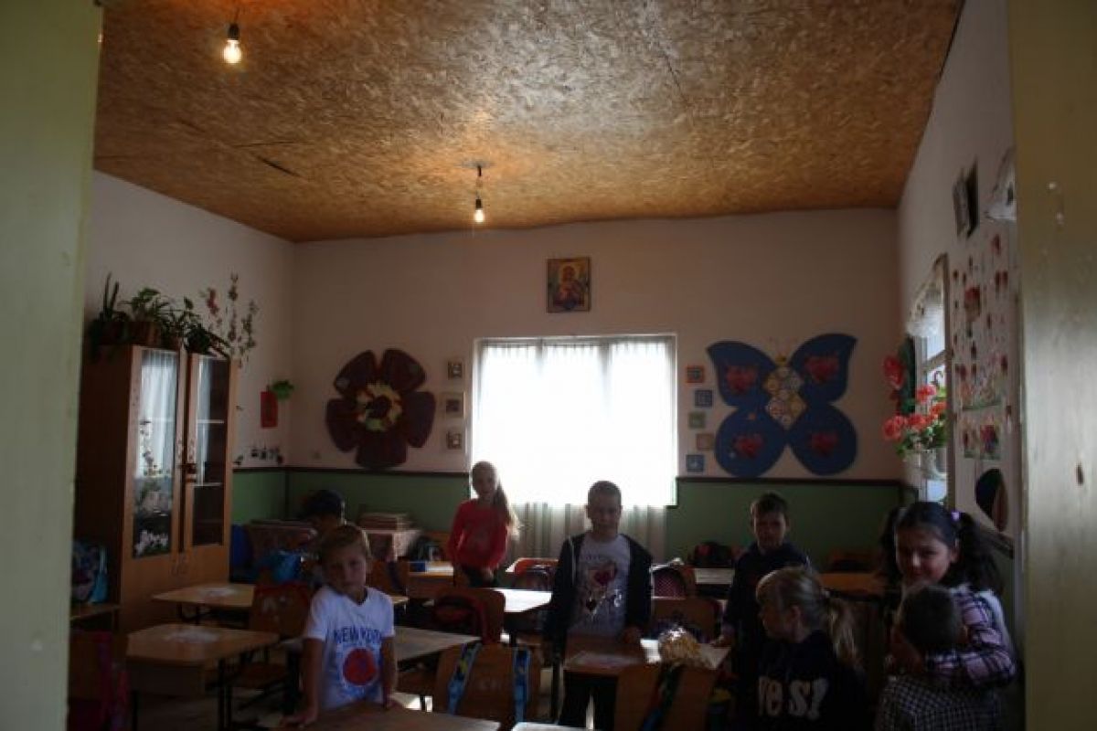 Tavanul celor două camere în care funcţionează grădiniţa şi şcoala primară este din placaj. Pare greu de crezut dar pur şi simplu tavanul este din placaj subţire. Din loc în loc, prin acest tavan sunt scoase fire cu bec la capăt. Acestea sunt corpurile de iluminat ale şcolii. Instalaţia electircă este foarte veche şi de multe apar becurile fac scrut-circuit.