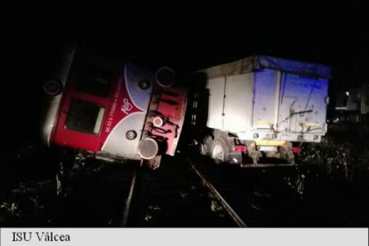 Accidentul rutier a avut loc în judeţul Vâlcea. Un tren a lovit un TIR după ce şoferul maşinii de mari dimensiuni a adormit la volan şi a ajuns pe șine. În urma coliziunii trenul, de tip automotor, s-a răsturnat şi trei persoane au fost rănite. Traficul feroviar a fost blocat mai multe ore în zonă, oamenii fiind nevoiţi să aleagă rute alternative.