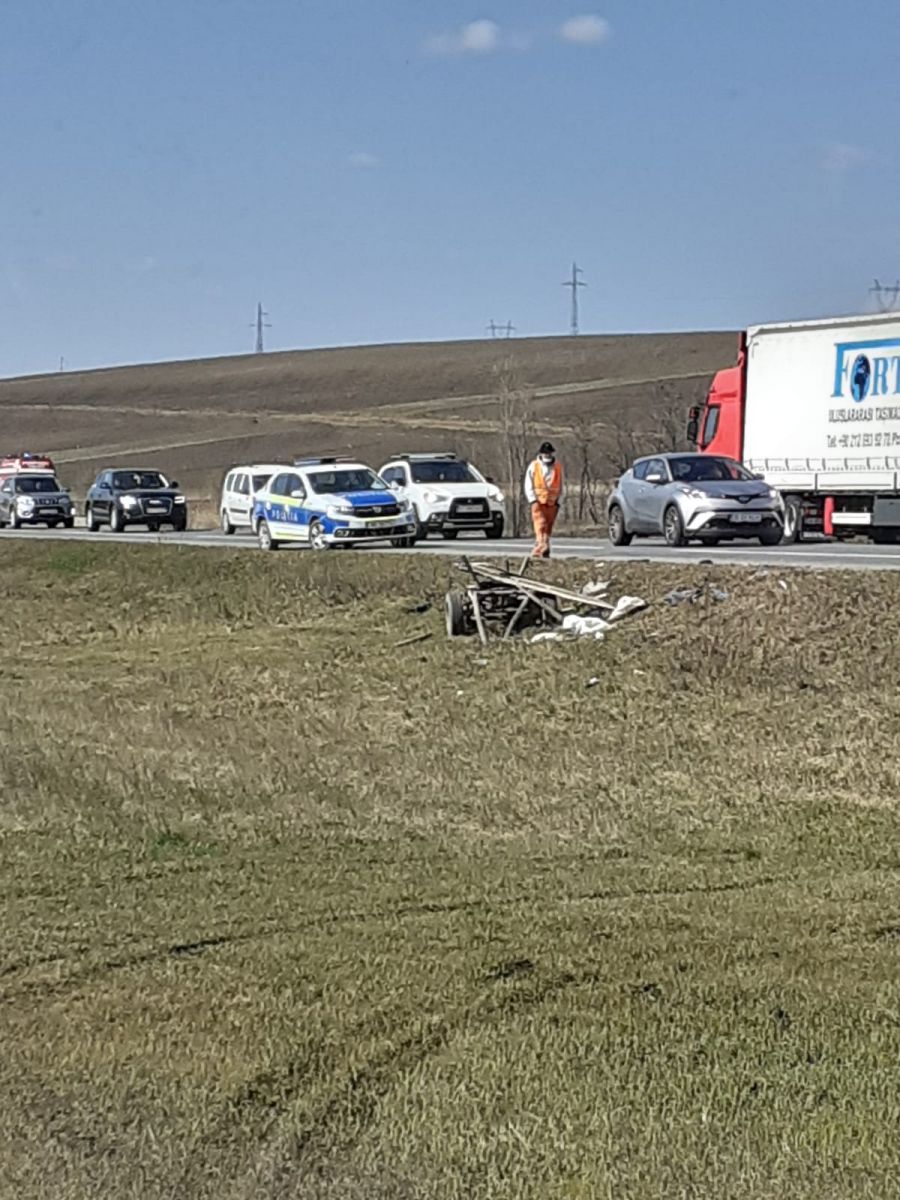 Autoturismul s-a răsturnat, iar căruța a fost pur și simplu făcută bucăți. În urma incidentului, care a avut loc între Podul Iloaiei şi Leţcani, pe Drumul European DE 583, o persoană fiin grav rănită.