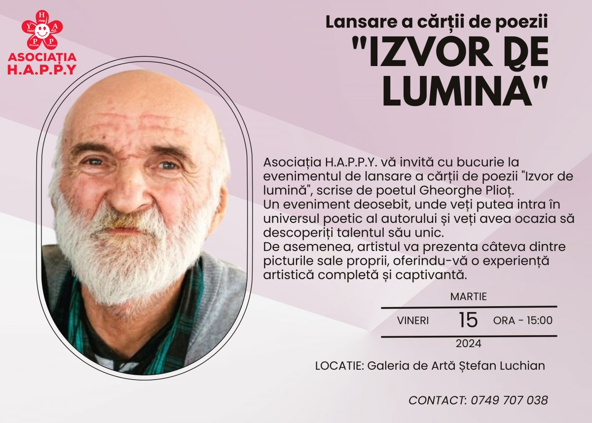 Asociația H.A.P.P.Y. vă invită cu bucurie la evenimentul de lansare a cărții de poezii "Izvor de lumină", scrise de poetul Gheorghe Plioț.