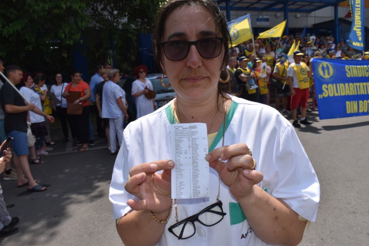 De altfel, una dintre asistentele de la laboratul de analize al spitalului a venit cu fluturașul de salariu și a arătat că după 32 de ani de activitate, beneficiază de un salariu de 3.500 de lei.