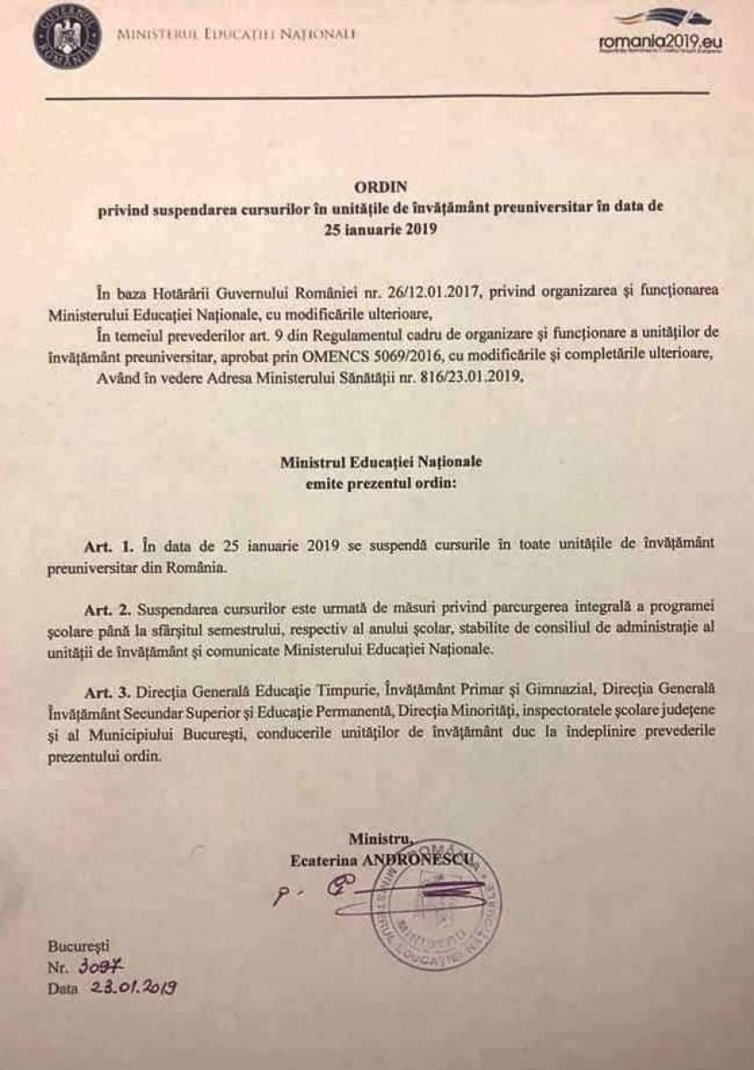 „În data de 25 ianuarie 2019 se suspendă cursurile în toate unităţile de învăţământ preuniversitar din România. Suspendarea cursurilor este urmată de măsuri privind parcurgerea integrală a programei şcolare până la sfârşitul semestrului, respectiv al anului şcolar, stabilite de consiliul de administraţie şi comunicate Ministerului Educaţiei Naţionale”,