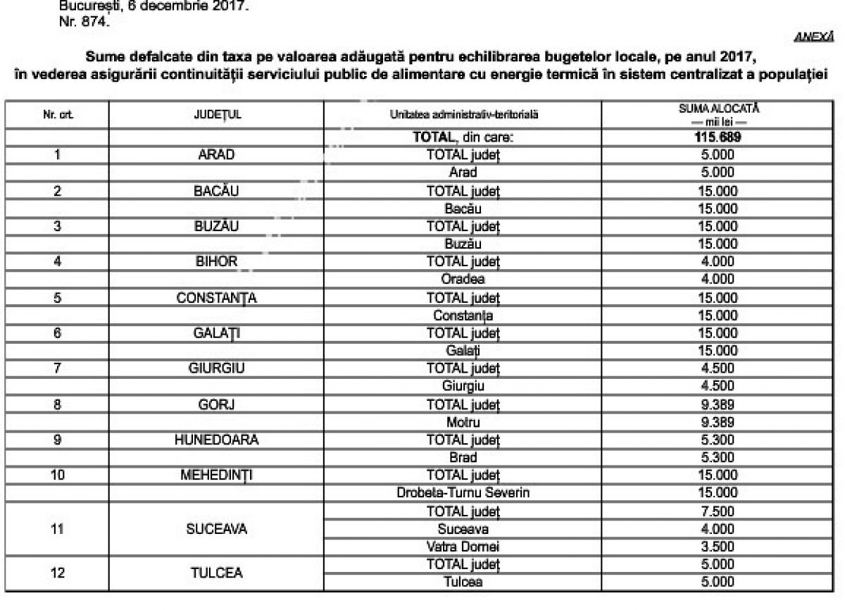 Prin HG 874/2017, Executivul a repartizat diverse sume către localități din 12 județe ”în vederea asigurării continuității serviciului public de alimentare cu energie termică în sistem centralizat”.