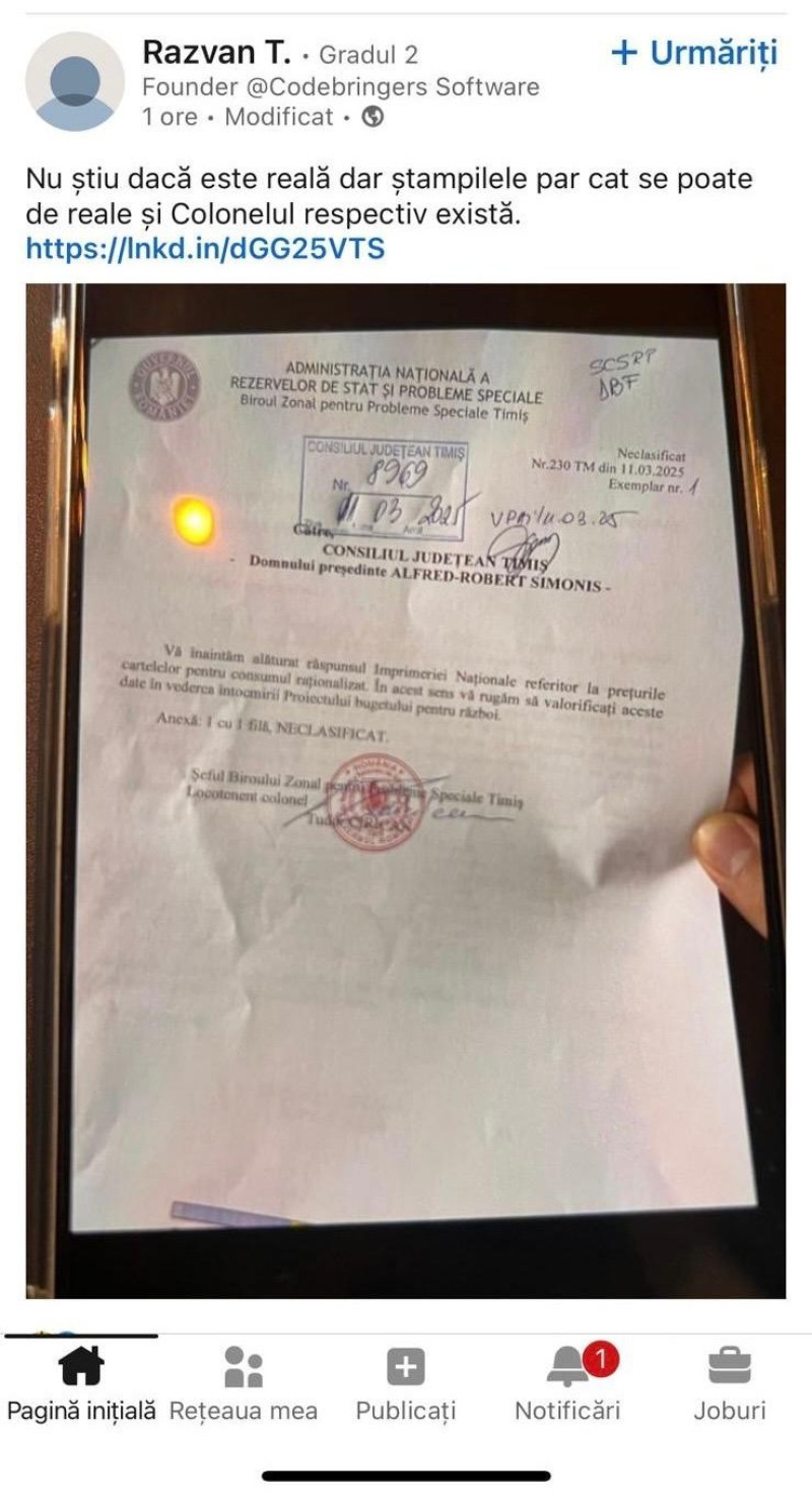 Ştirea a fost generată de o adresă a Biroului Zonal pentru Probleme Speciale Timiş din cadrul Administraţiei Naţionale a Rezervelor de Stat şi Probleme Speciale transmisă Consiliului Judeţean Timiş, conform digi24.ro.