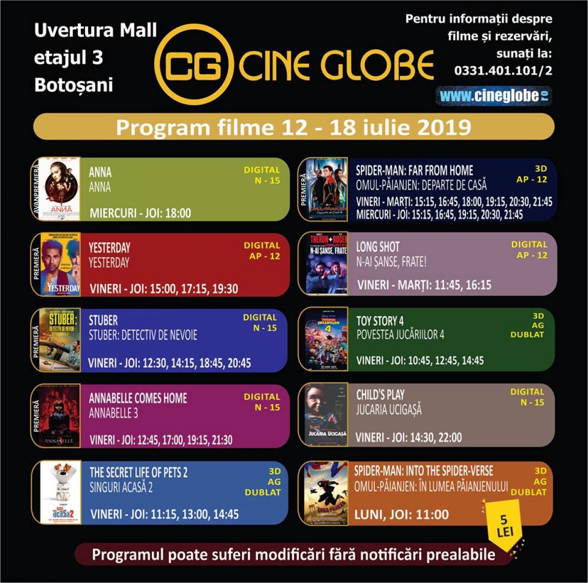 Reprezentanţii Cine Globe au făcut public programul filmelor care rulează săptămâna aceasta pe marile ecrane de la Botoşani.