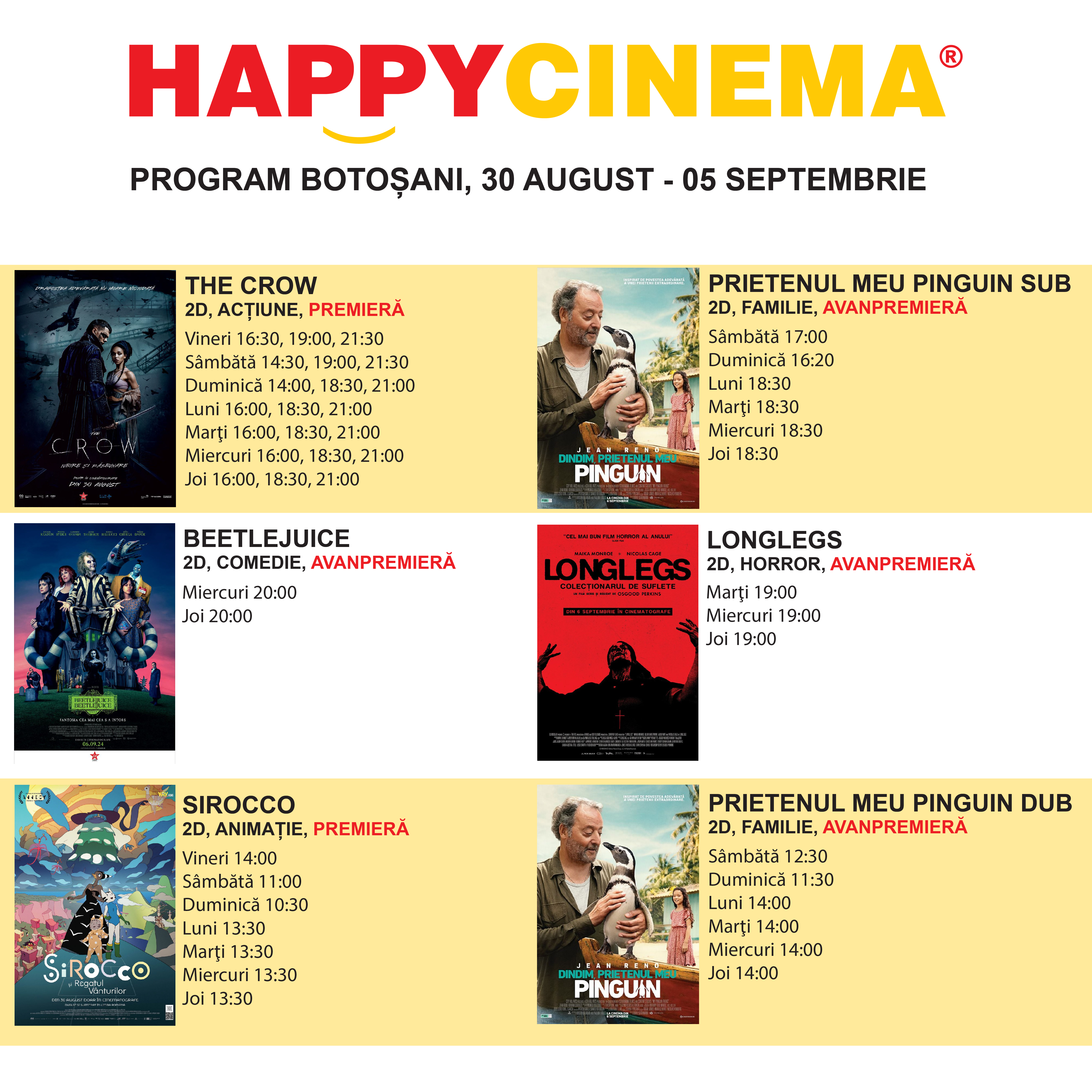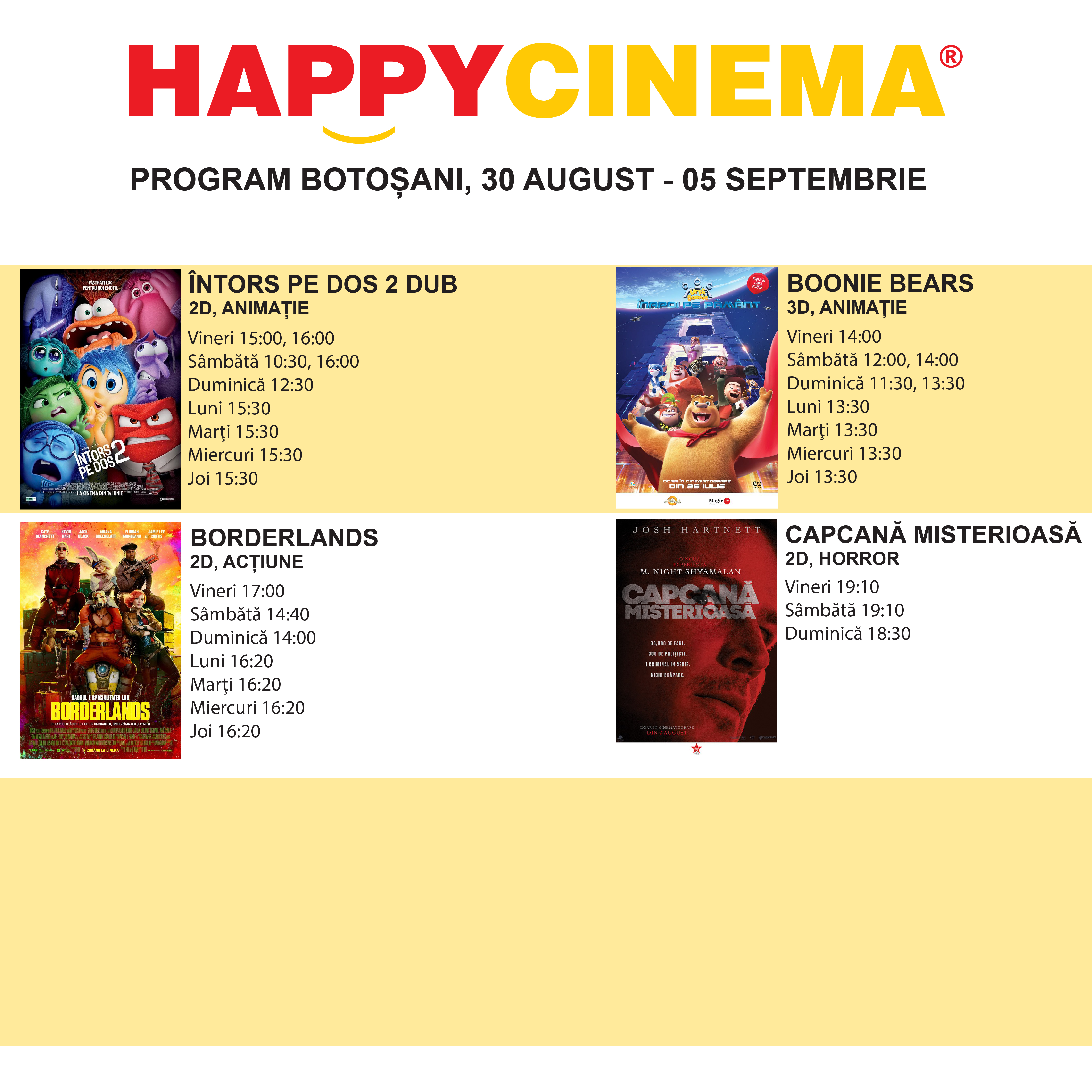 Happy Cinema Botoșani a transmis programul filmelor care vor rula în multiplexul din Uvertura Mall în perioada 30 august – 5 septembrie.