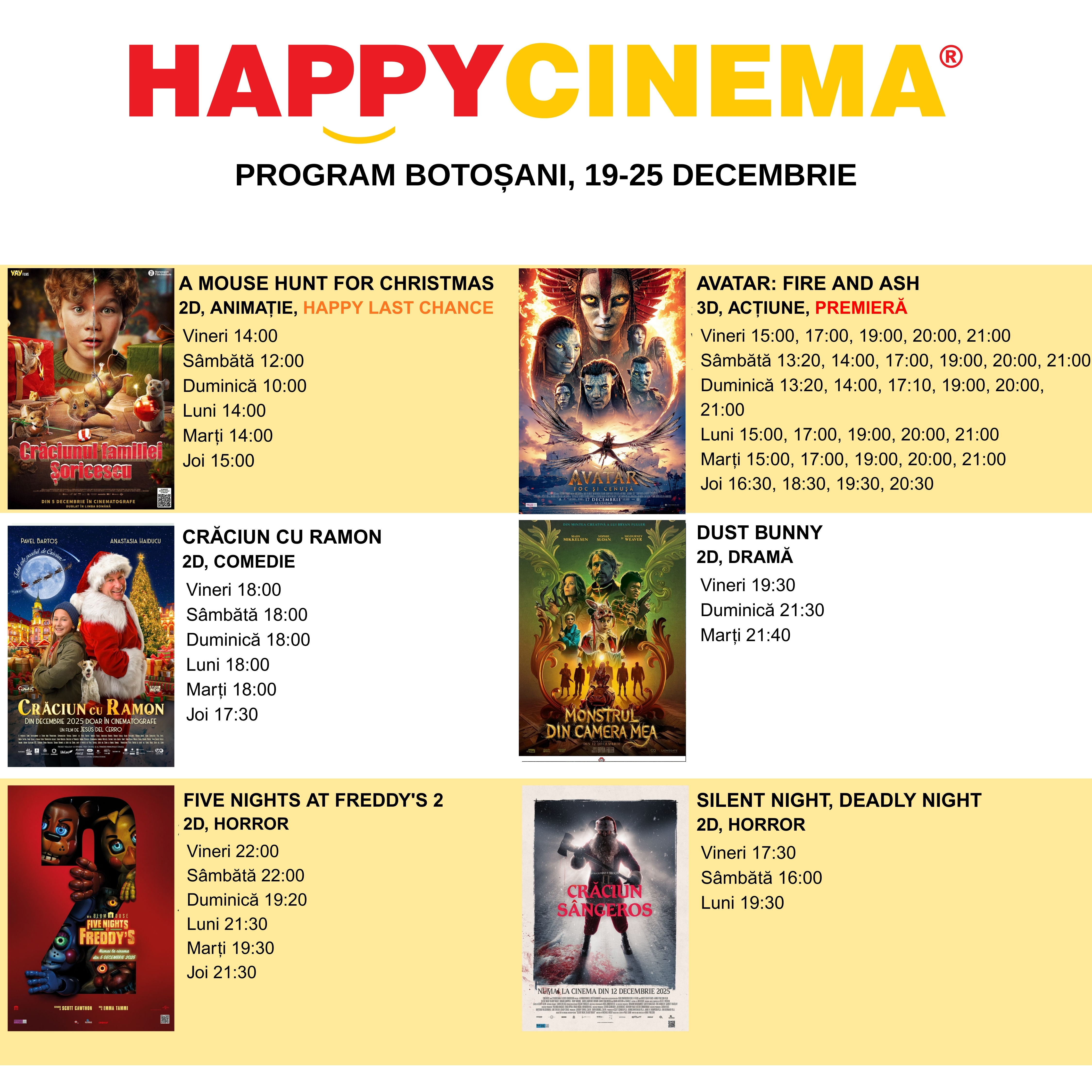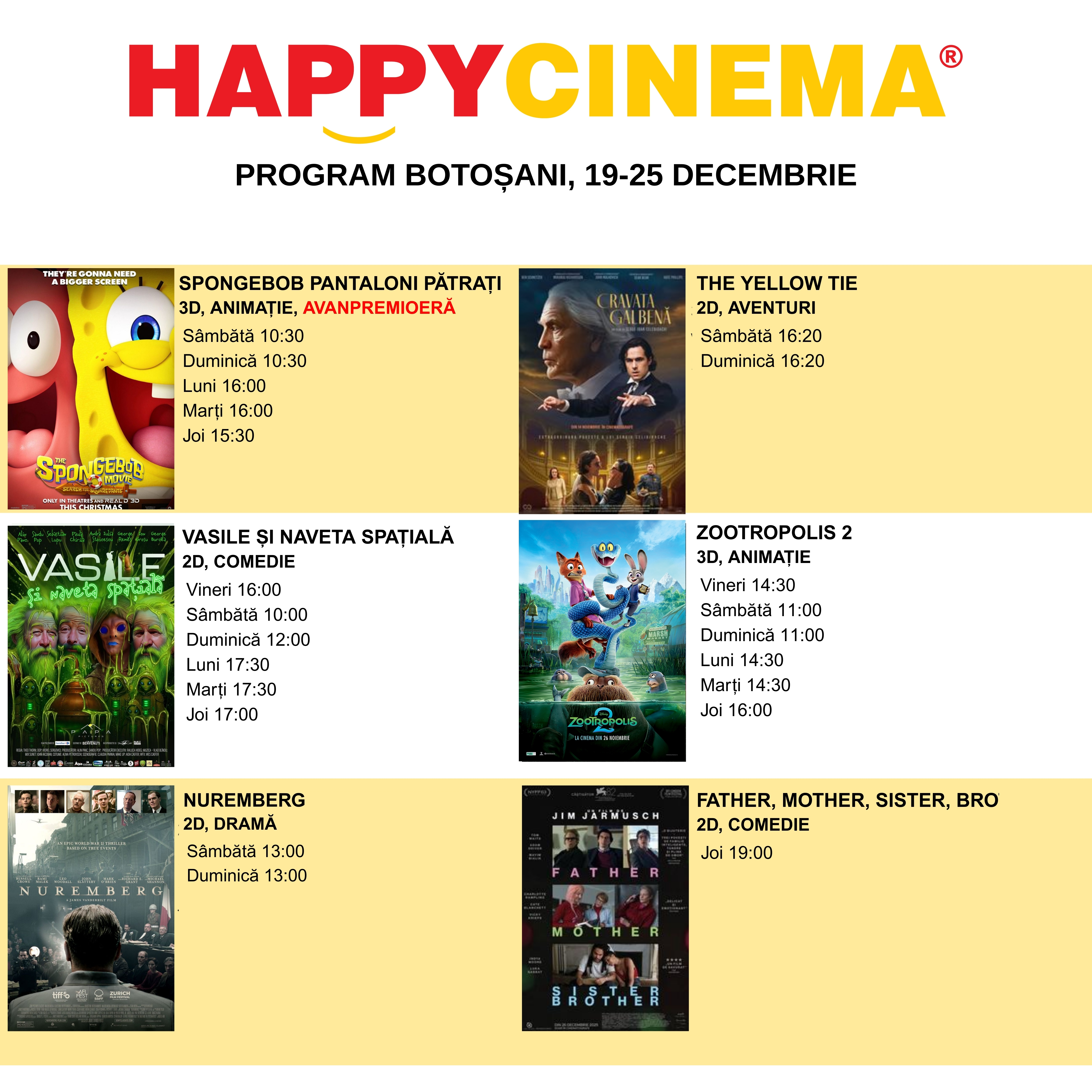 Happy Cinema Botoșani a publicat programul filmelor pentru perioada 19–25 decembrie.