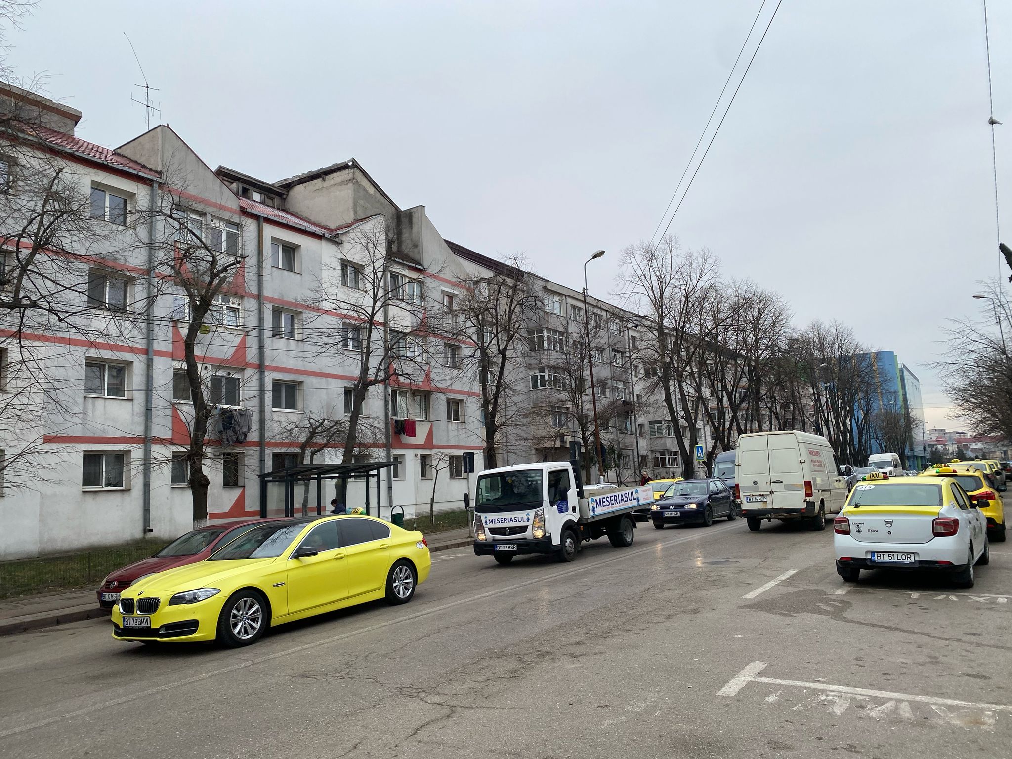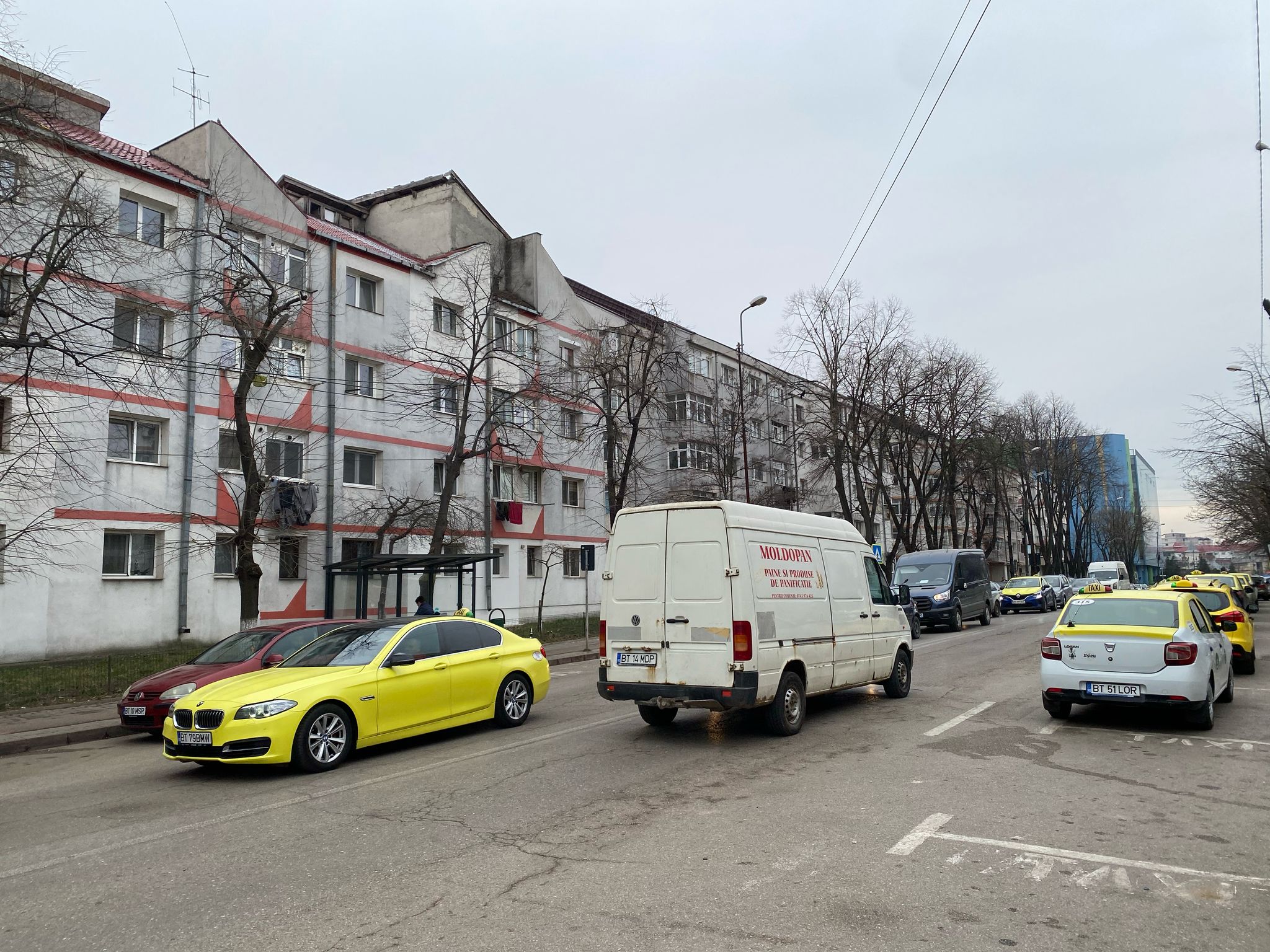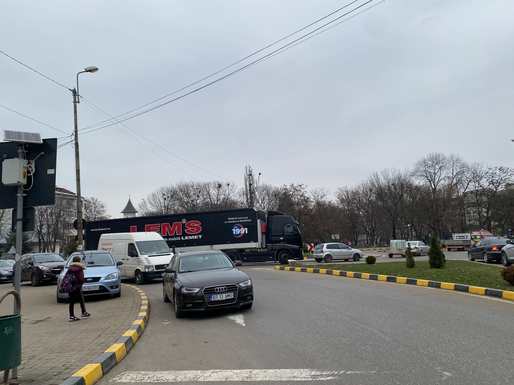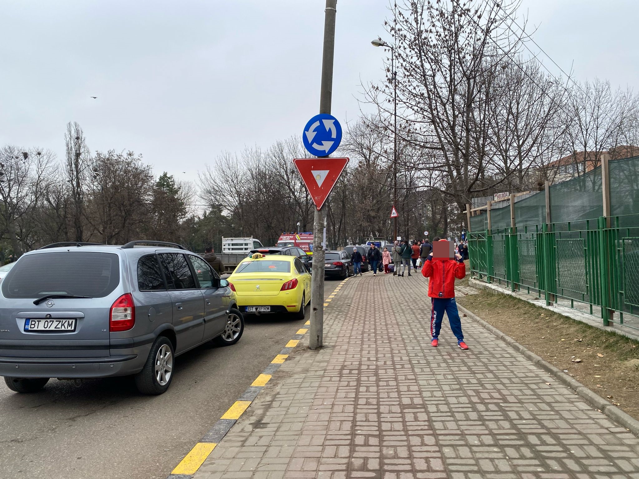 Disconfortul nu se oprește doar la trotuar. Banda carosabilă de pe partea dreapta, destinată circulației rutiere, este și ea ocupată de mașini oprite, care blochează complet traficul. În acest context, sensul giratoriu din apropiere devine de cele mai multe ori un punct de congestionare severă, iar cozile de mașini se întind pe zeci de metri, ajungând până în zona Uvertura Mall.