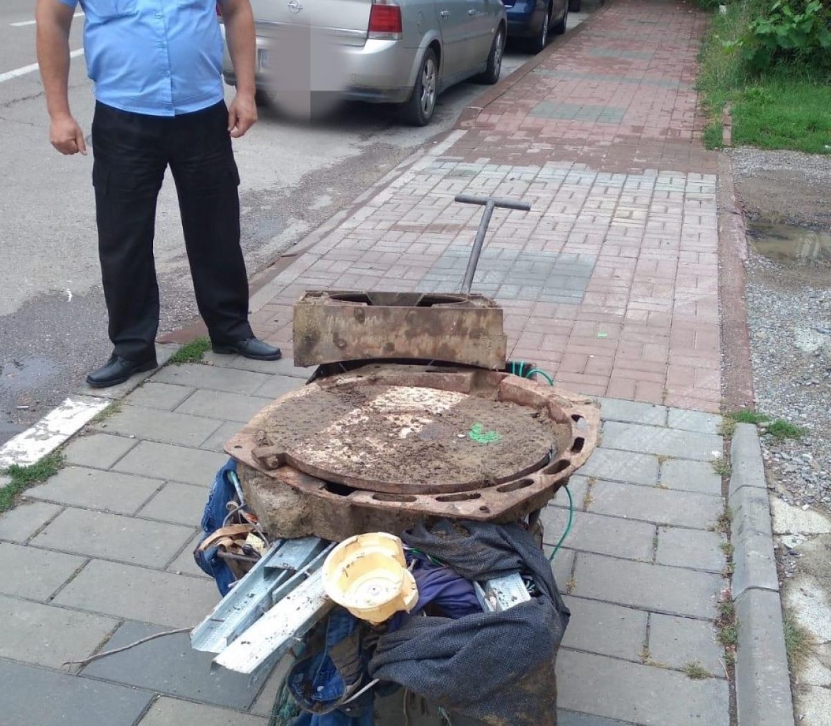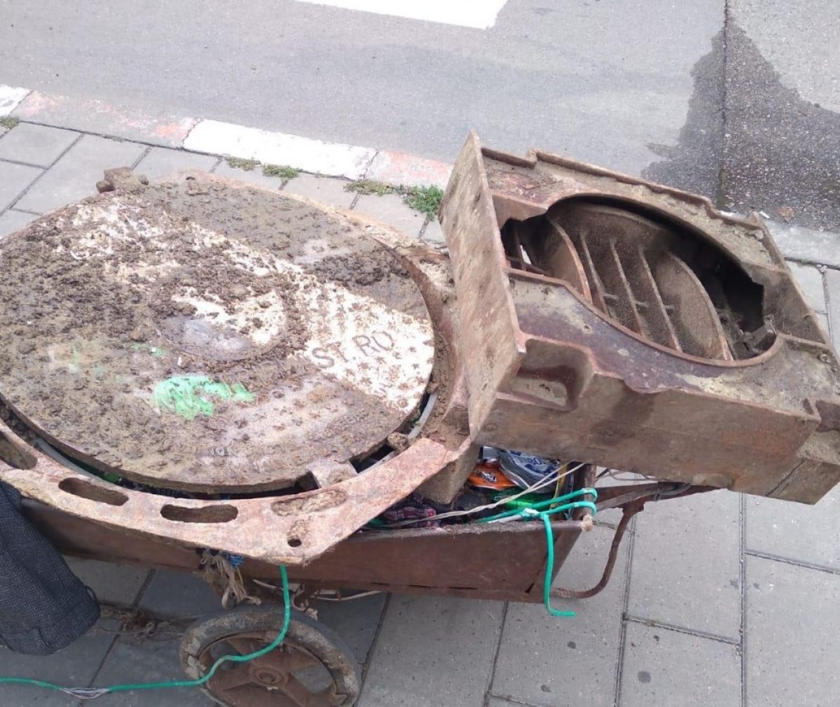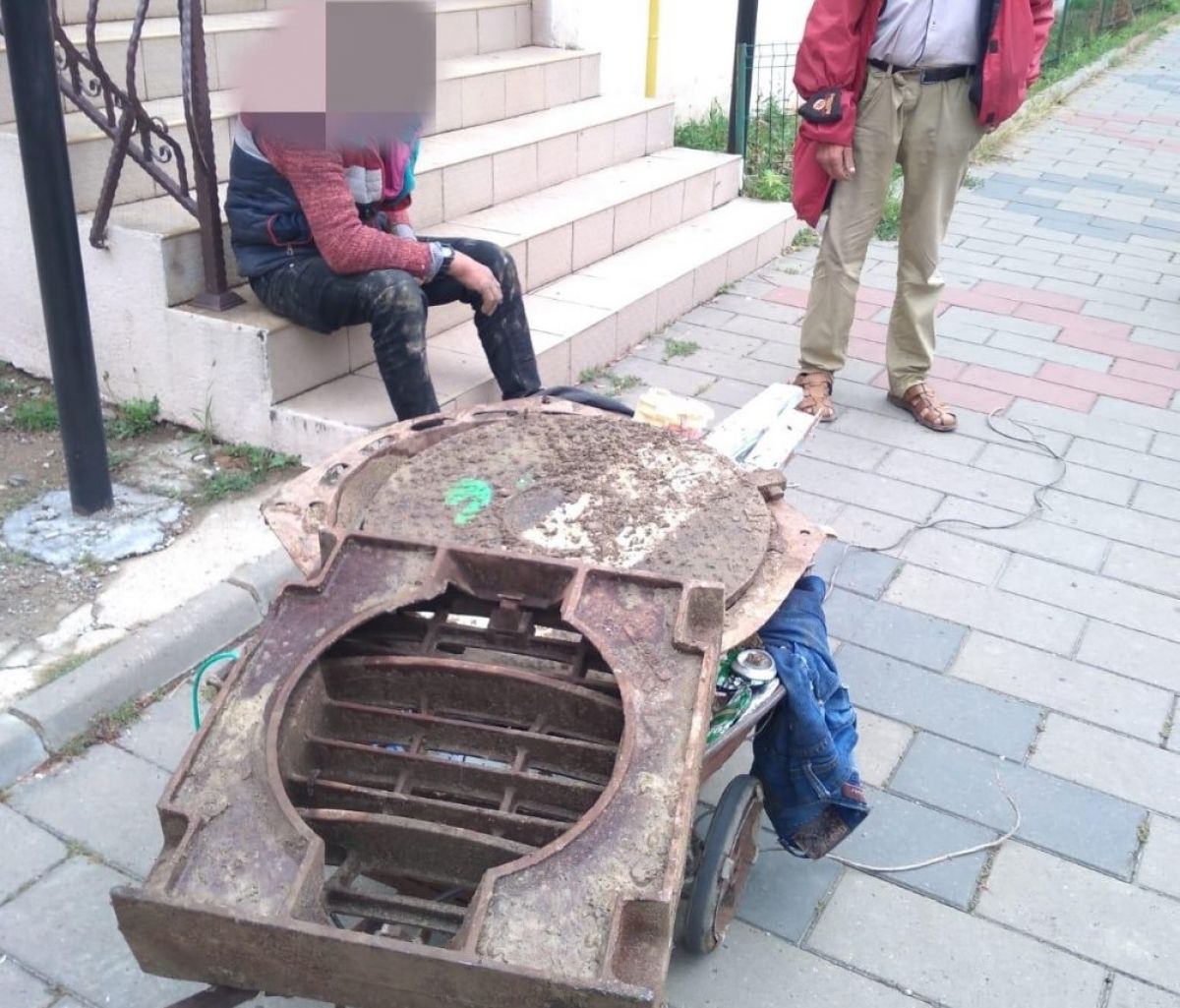 Cei doi transportau într-un căruț elemente de canalizare (capac de canal și capac de aerisire canalizare).