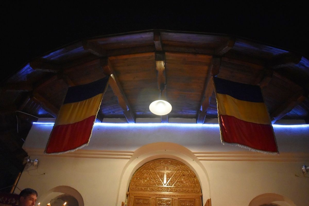 Slujba s-a desfășurat sub două steaguri tricolore.