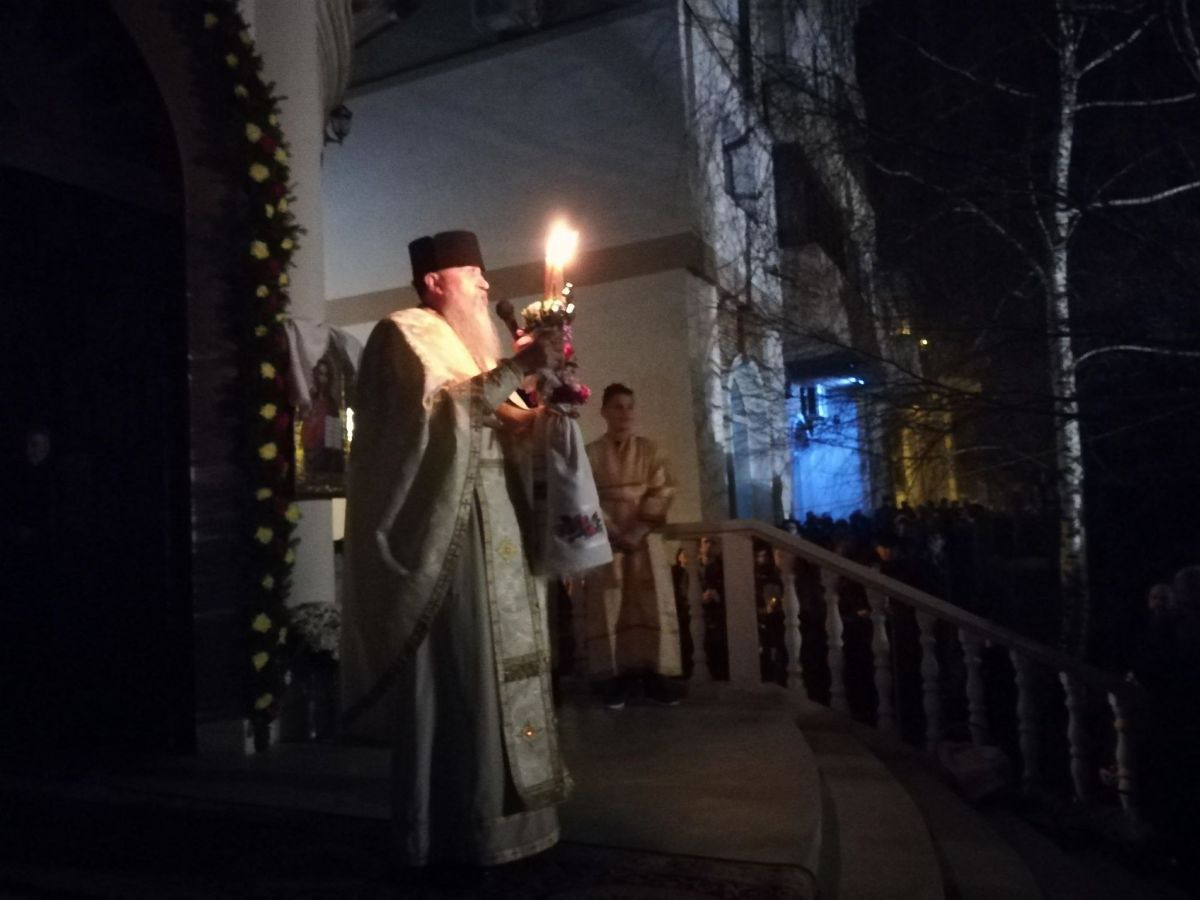 Preotul a citit din Sfânta Evanghelie, iar apoi a vestit „Hristos a Înviat!” Și imediat, credincioșii au răspuns într-un singur glas, „Adevărat a Înviat”, făcând să răsune curtea lăcașului de cult. După toate acestea mulțimea a început să cânte: „Hristos a Înviat din morți / Cu moartea pe moarte călcând / ’Și celor din morminte / Viață dăruindu-le”.