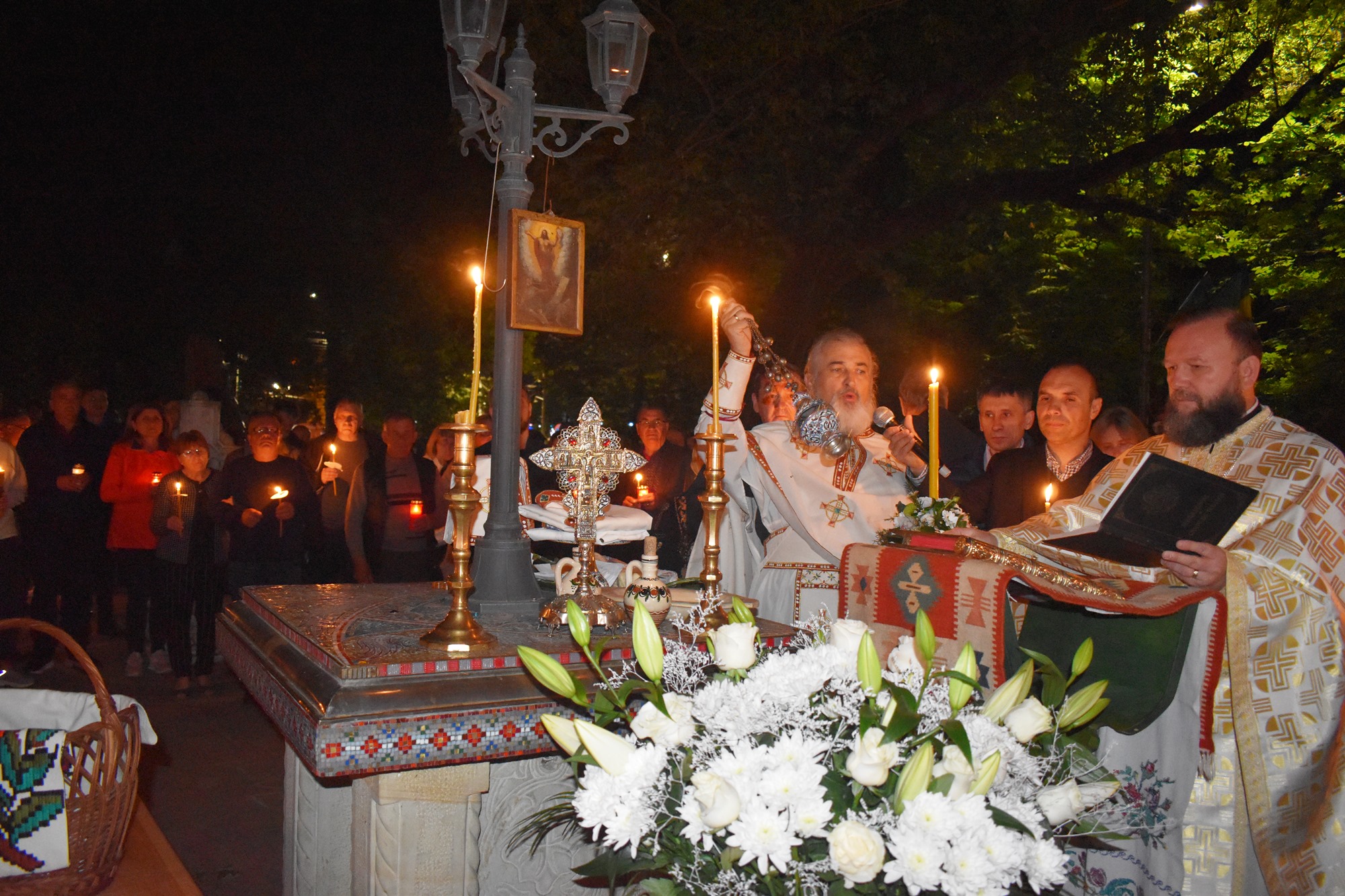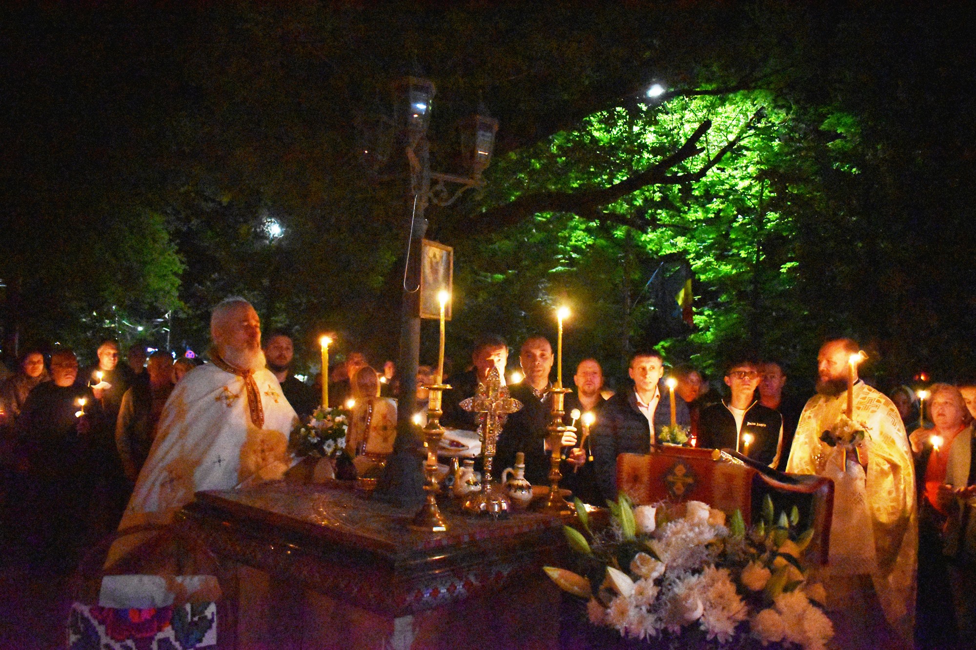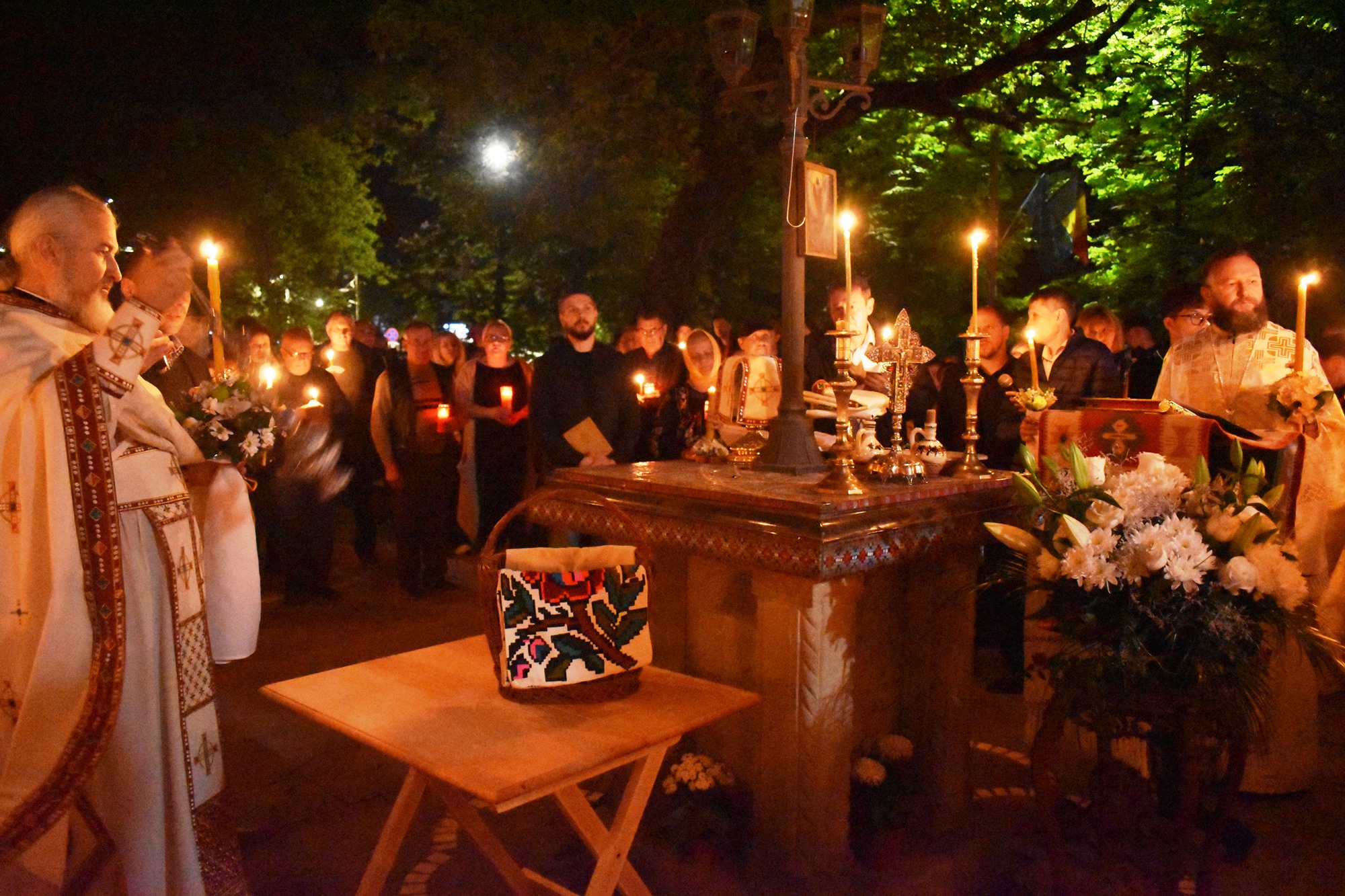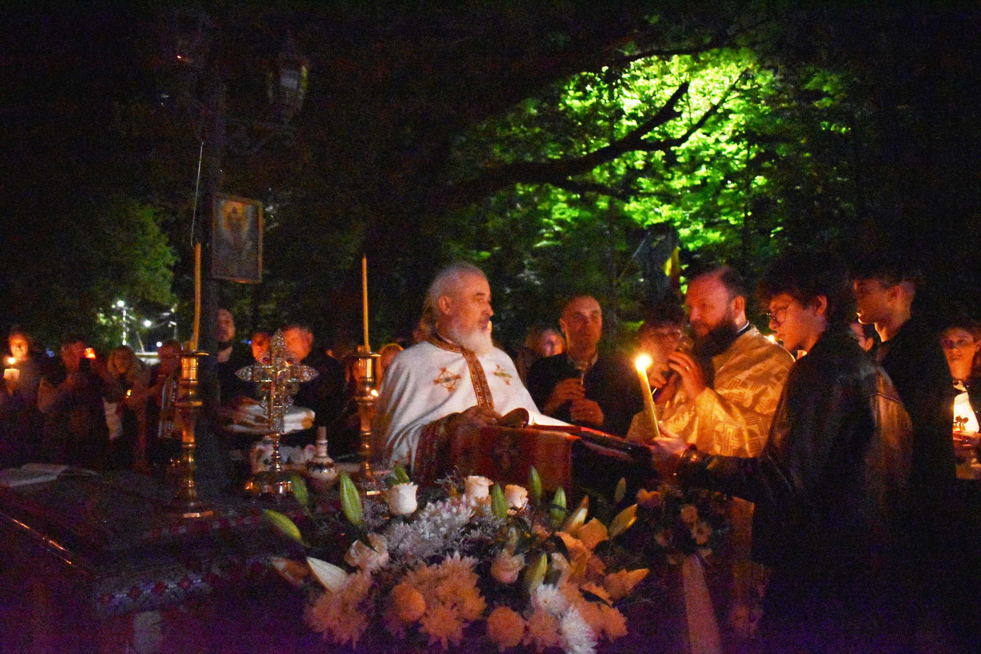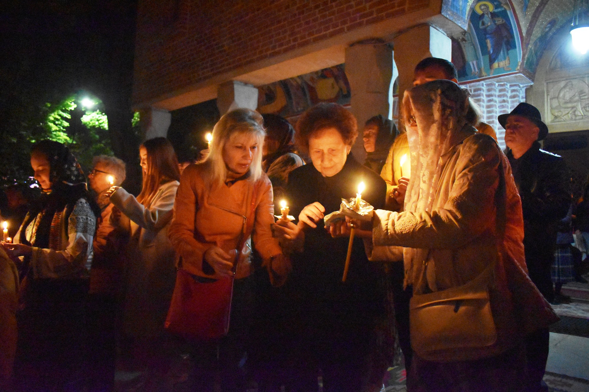 În sunete de clopot, în puține minute curtea s-a umplut de lumină, mulțimea cântând în cor: Hristos a Înviat din morți / Cu moartea pe moarte călcând / Și celor din morminte / Pace dăruindu-le.