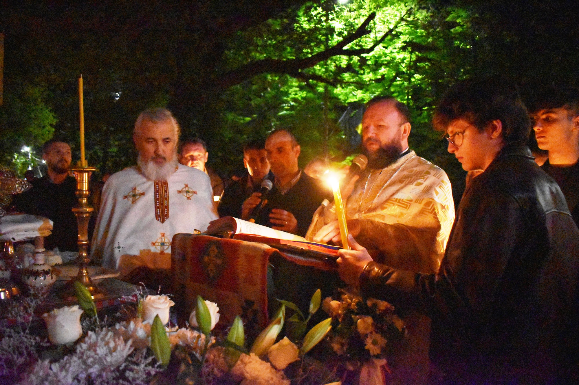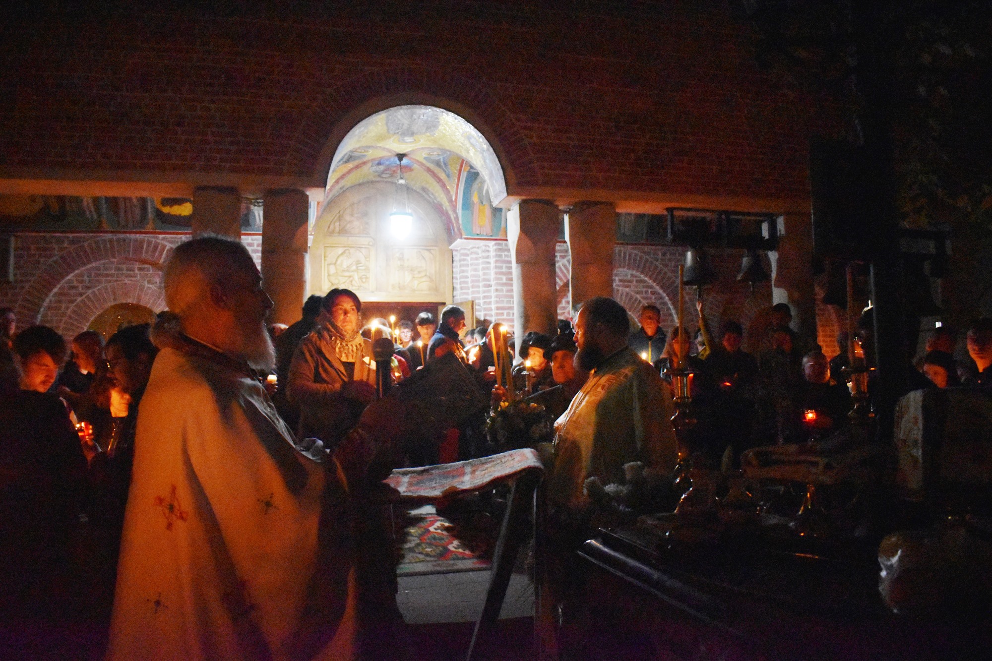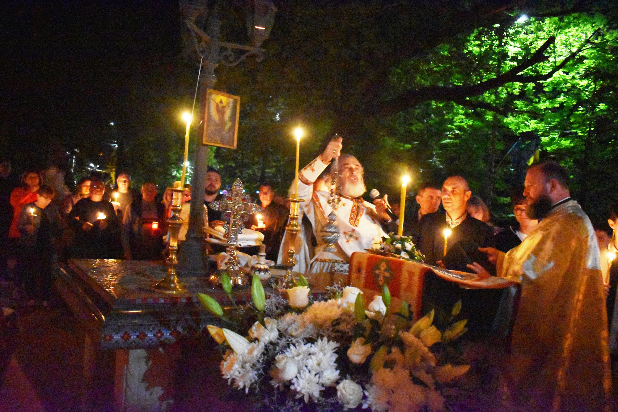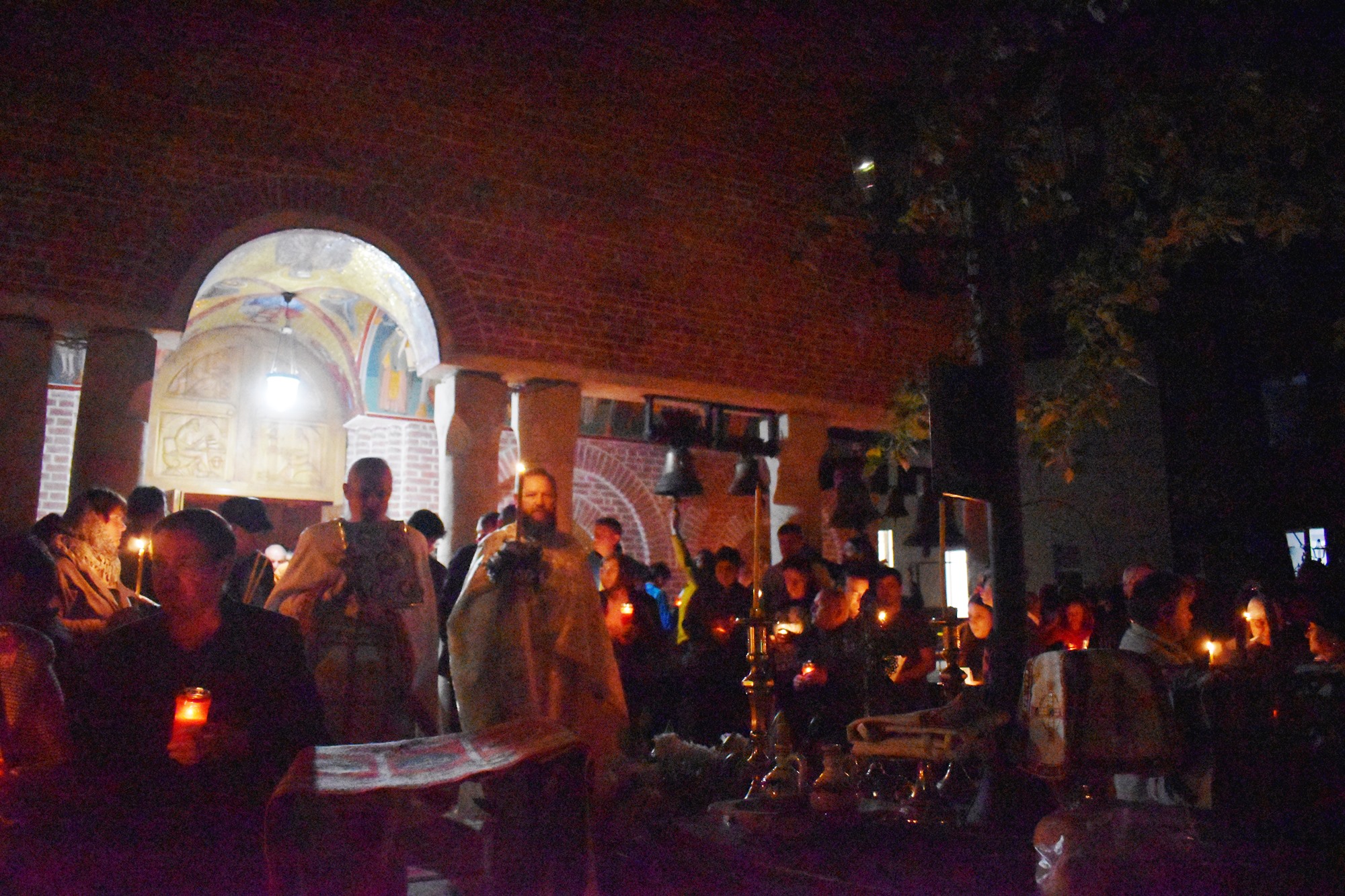 În sunete de clopot, în puține minute curtea s-a umplut de lumină, mulțimea cântând în cor: Hristos a Înviat din morți / Cu moartea pe moarte călcând / Și celor din morminte / Pace dăruindu-le.