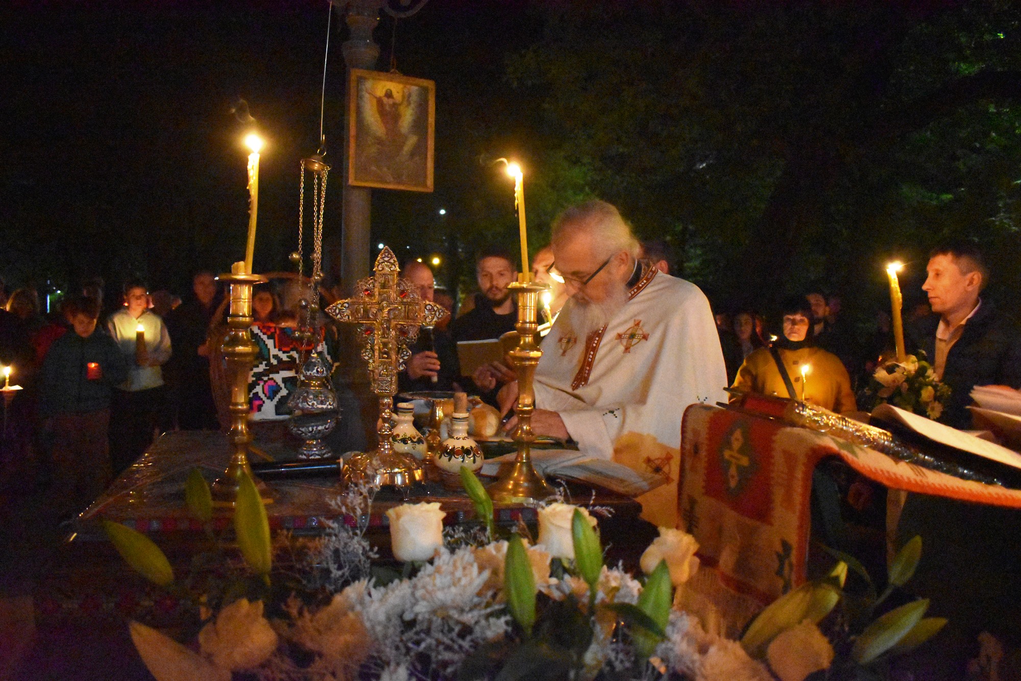 Preotul Petru Chirvase a făcut proscomidia în mijlocul enoriașilor, după care a vestit: ”Frați creștini, Hristos a Înviat!”, iar frații creștini i-au răspuns în cor: ”Adevărat a Înviat”.