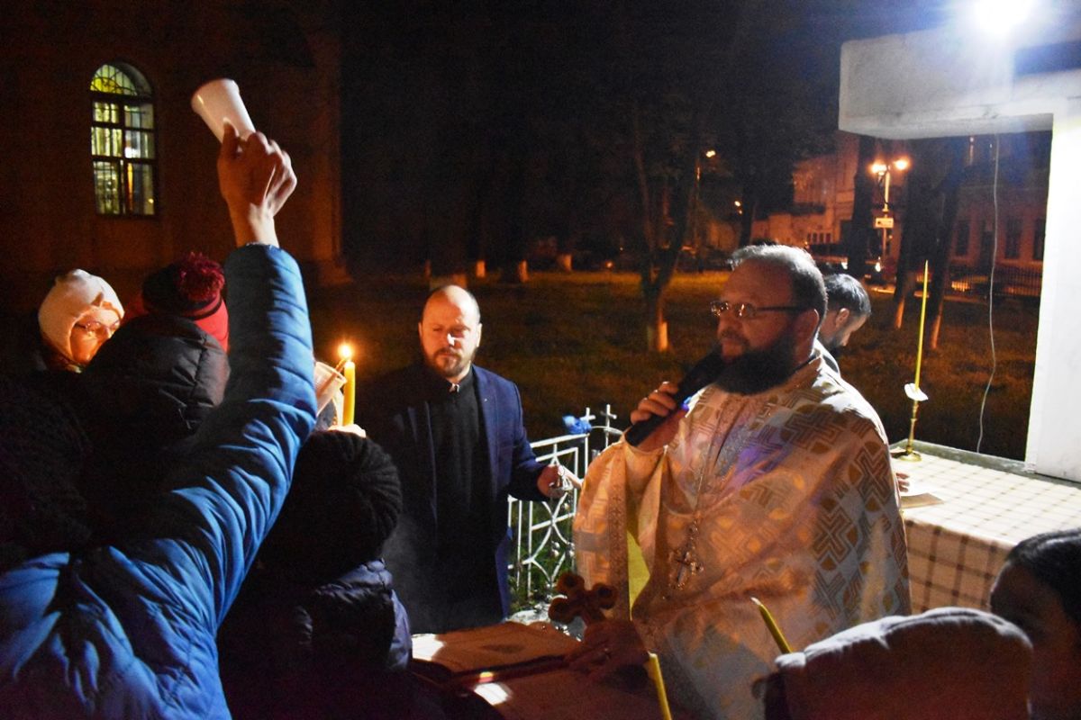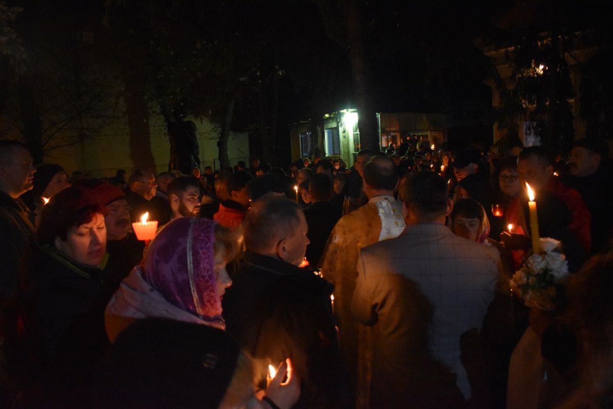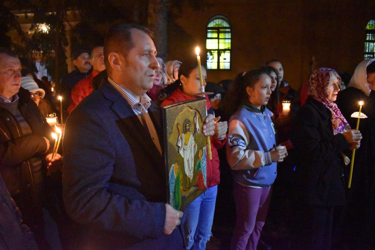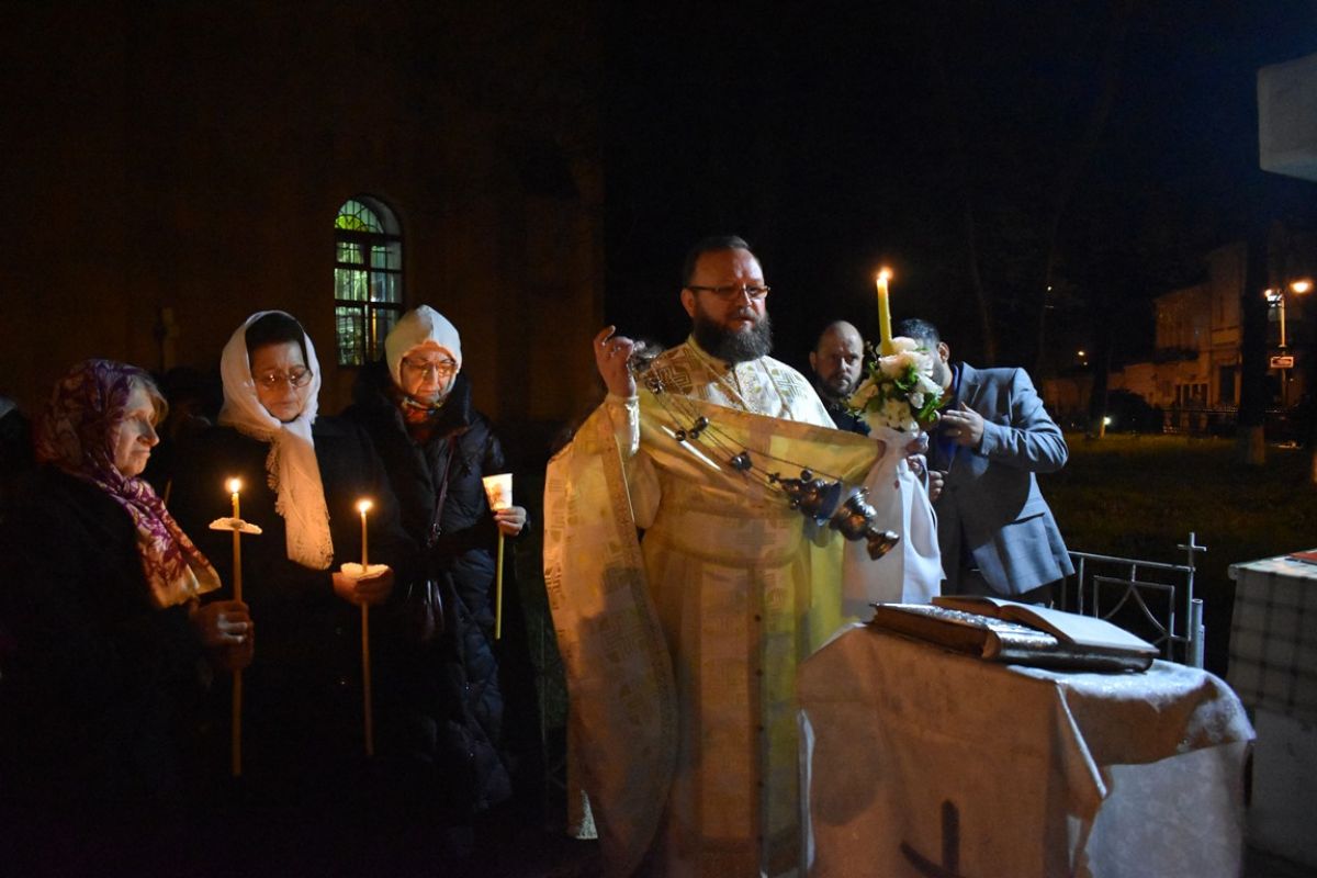 ”Hristos a Înviat”! a vestit părintele Cristian Buhaciuc, iar credincioșii din curte i-au răspuns într-un glas: ”Adevărat a Înviat!”