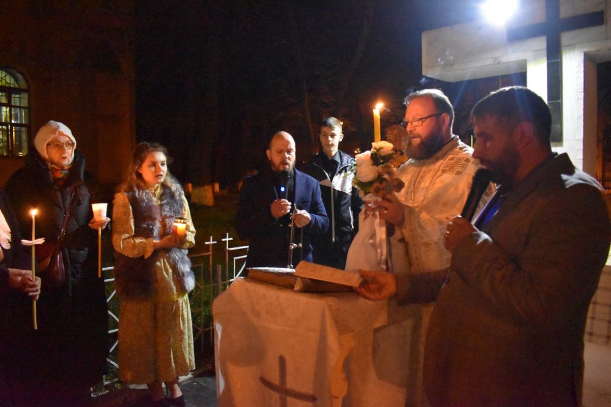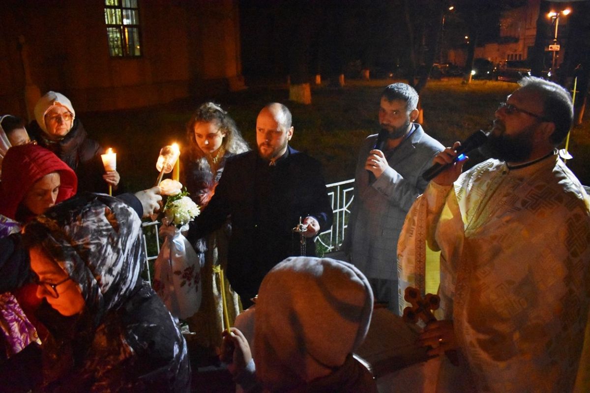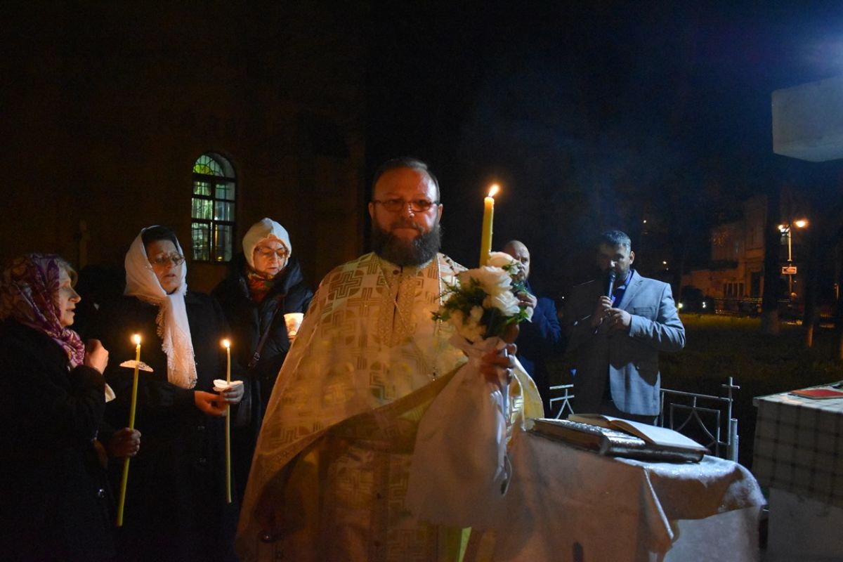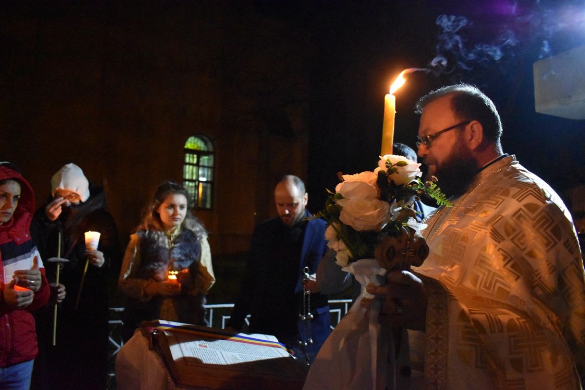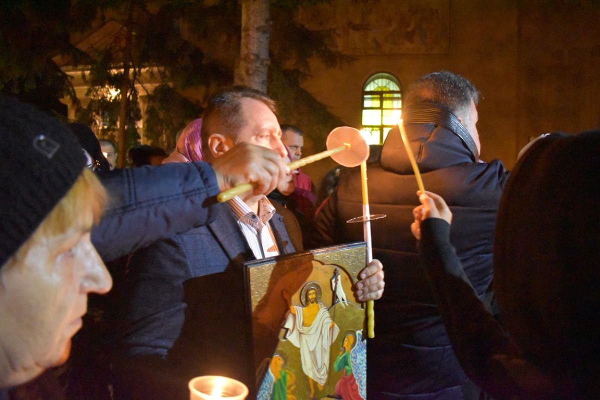 ”Hristos a Înviat”! a vestit părintele Cristian Buhaciuc, iar credincioșii din curte i-au răspuns într-un glas: ”Adevărat a Înviat!”