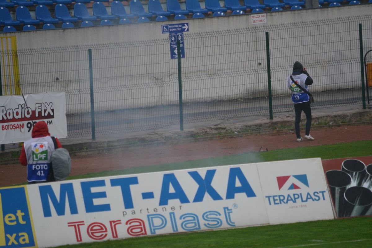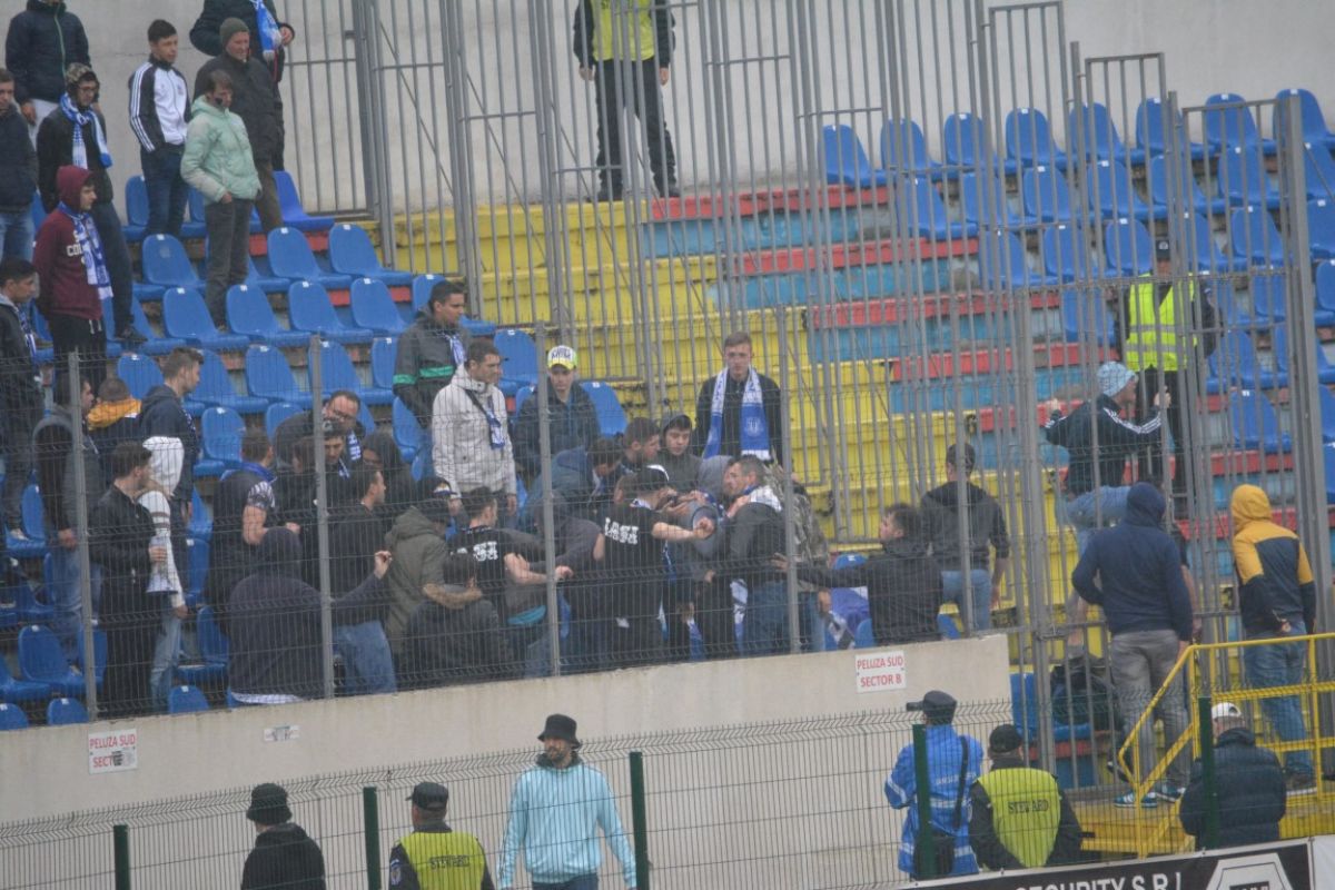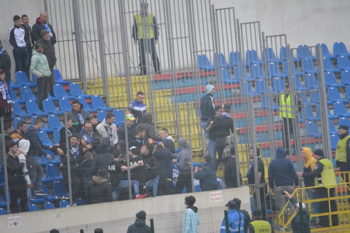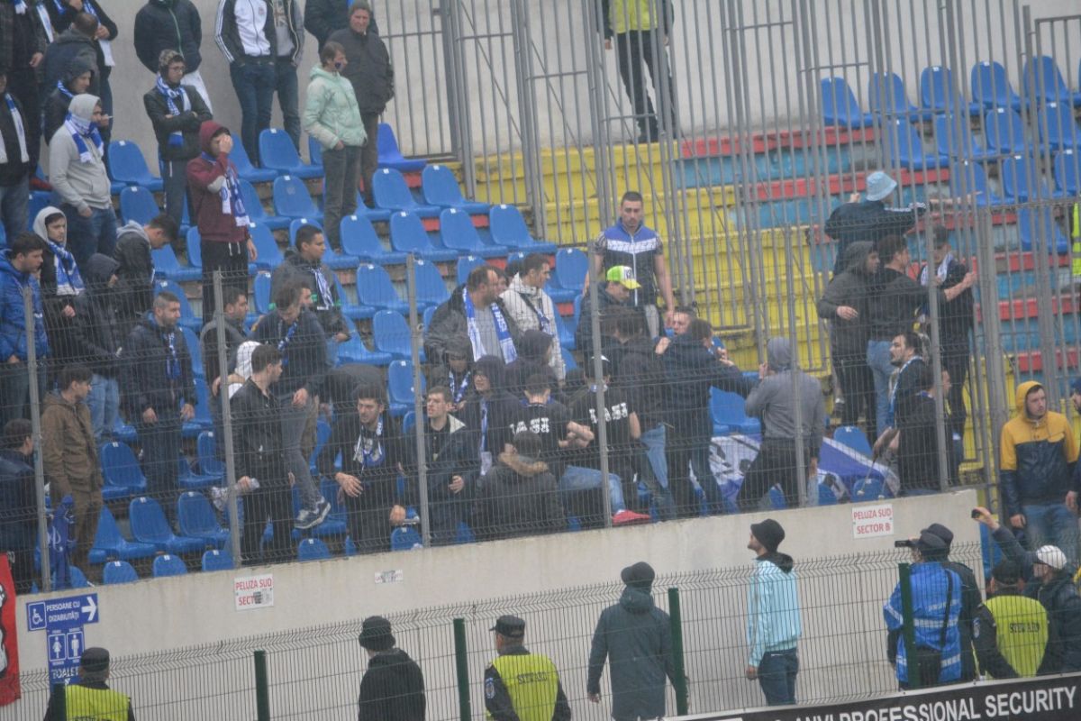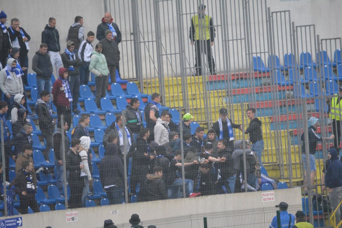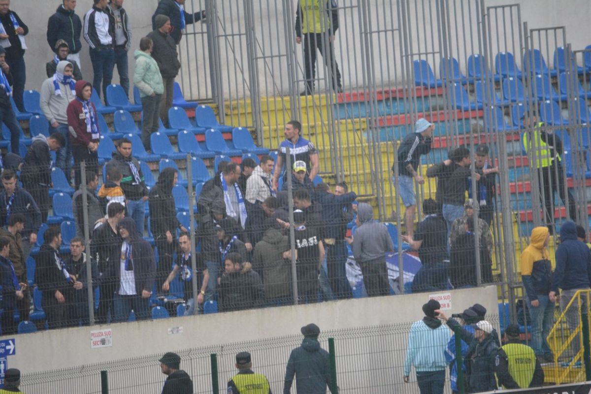 Mai întâi ieşenii s-au urcat unii în spatele altora pentru a putea agăţa bannerele pe gard, însă după doar vreo cinci minute de joc au început să le dea jos. Şi aceasta după ce suporterii alb-albaştrilor s-au luat la bătaie între ei, moment în care au şi aruncat o petardă pe teren.