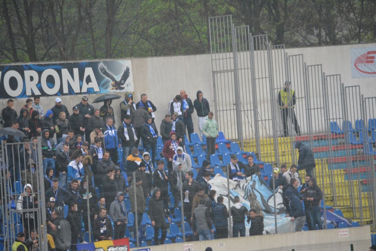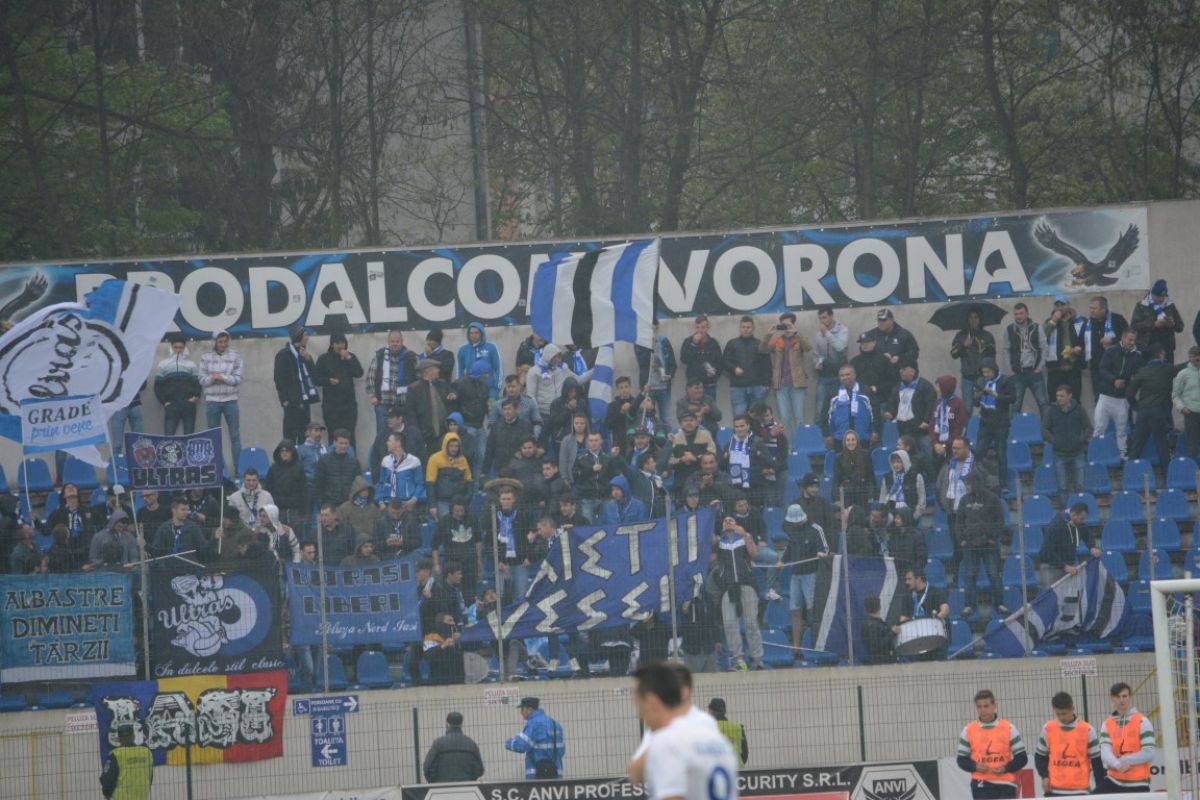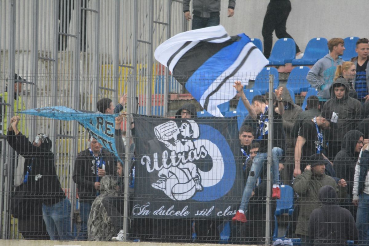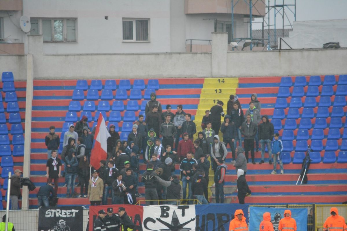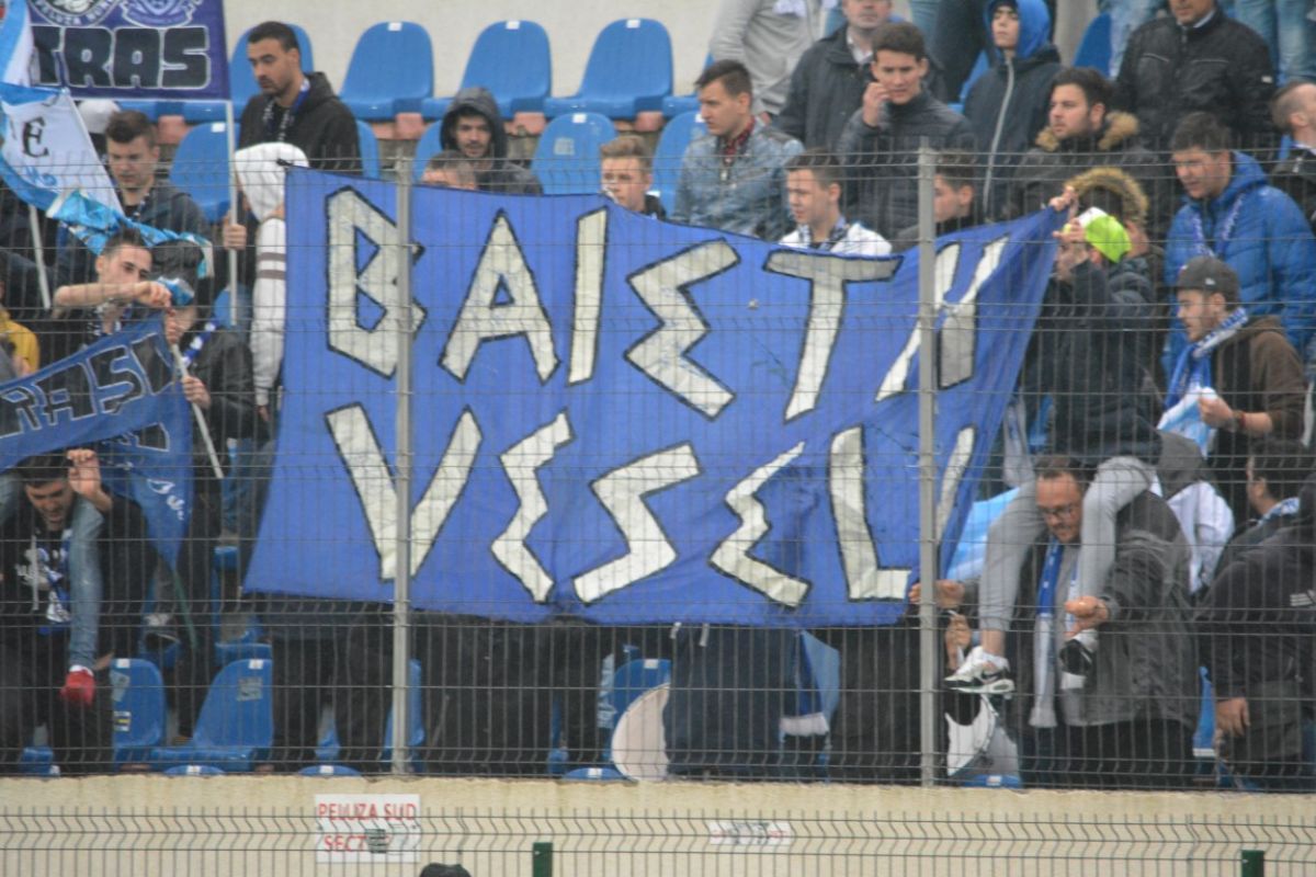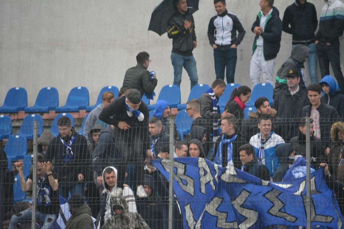 Mai întâi ieşenii s-au urcat unii în spatele altora pentru a putea agăţa bannerele pe gard, însă după doar vreo cinci minute de joc au început să le dea jos. Şi aceasta după ce suporterii alb-albaştrilor s-au luat la bătaie între ei, moment în care au şi aruncat o petardă pe teren.