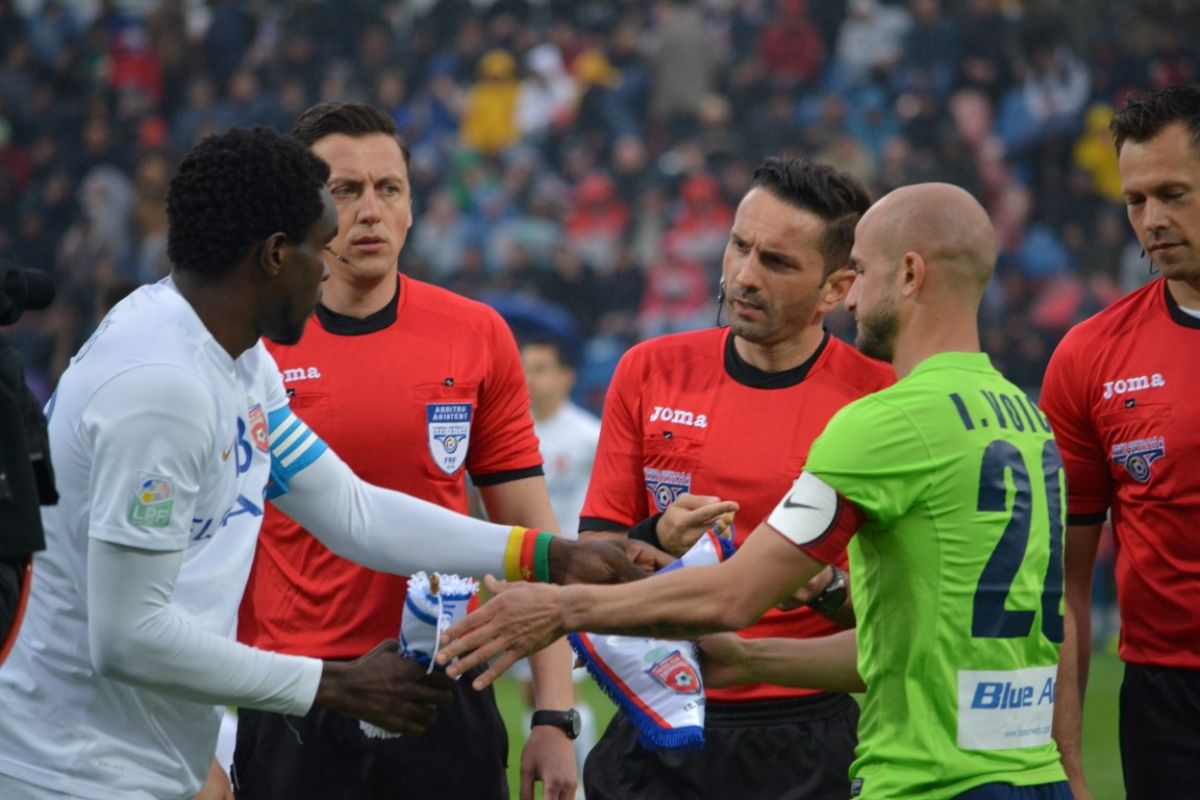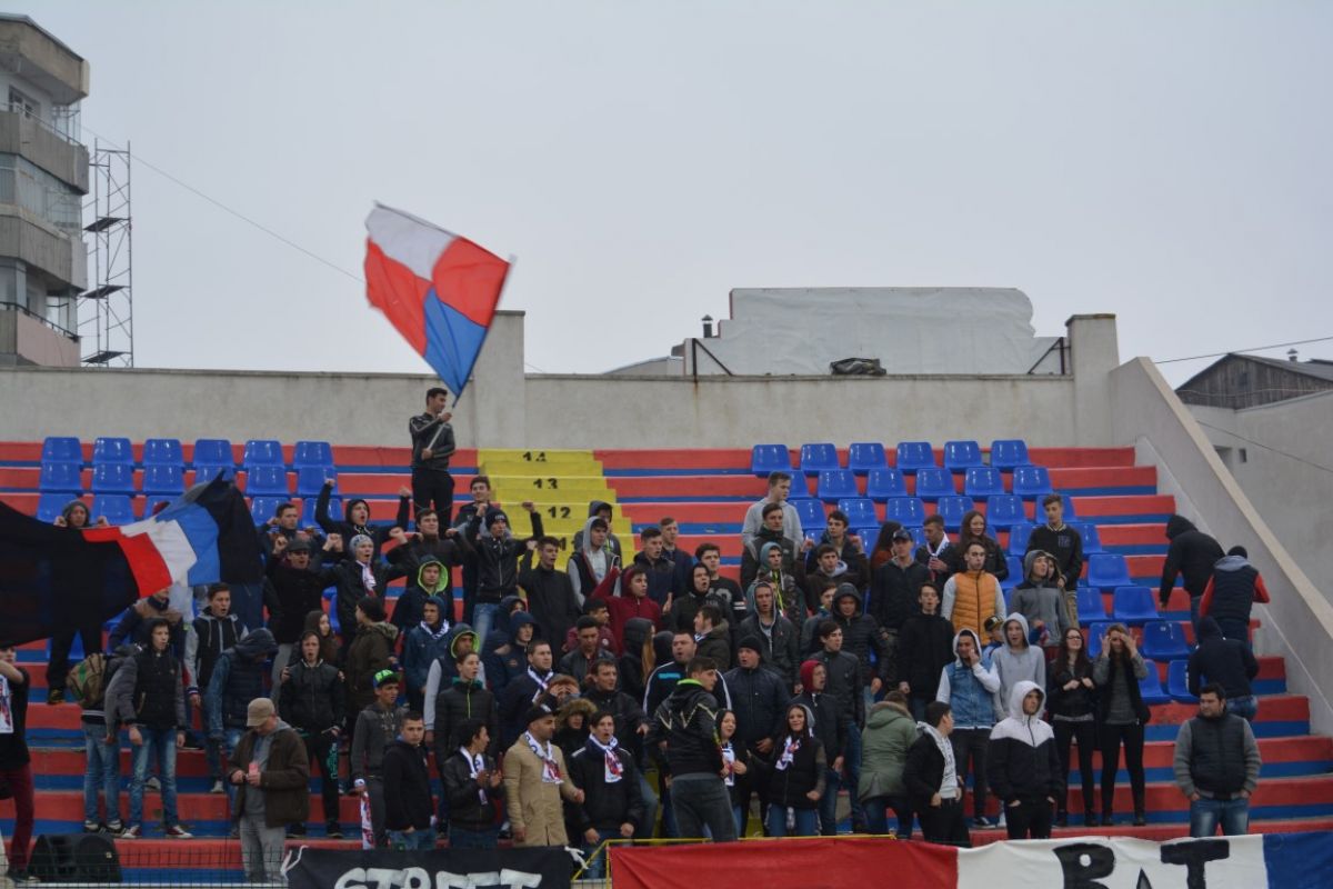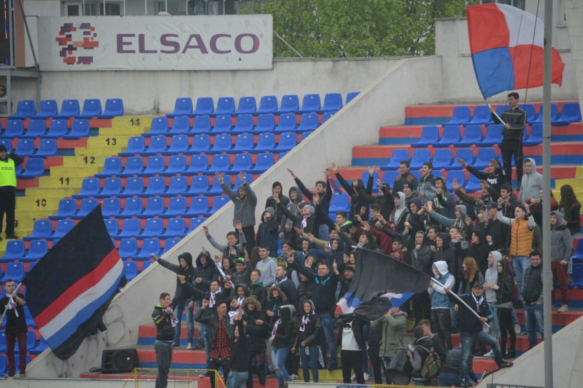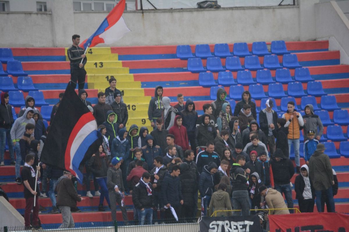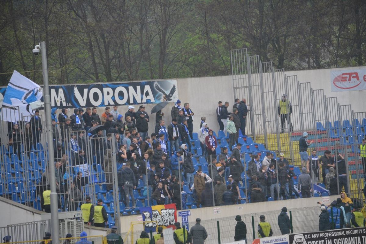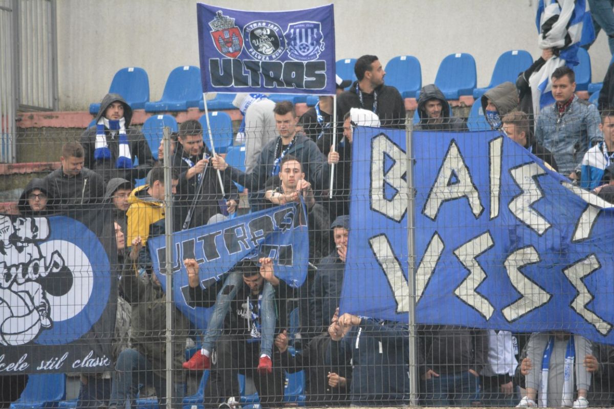 Mai întâi ieşenii s-au urcat unii în spatele altora pentru a putea agăţa bannerele pe gard, însă după doar vreo cinci minute de joc au început să le dea jos. Şi aceasta după ce suporterii alb-albaştrilor s-au luat la bătaie între ei, moment în care au şi aruncat o petardă pe teren.