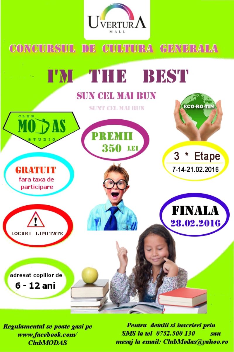 Duminică, 07 februarie,între orele 14.00 -16.00, la acelaşi nivel se desfășoară prima ediție a concursului de cultură generală “I’m The Best”. Concursul se adresează copiiilor cu vârste cuprinse între 6-12 ani și se pot înscrie GRATUIT toți cei care doresc să își arate cunoștințele generale.