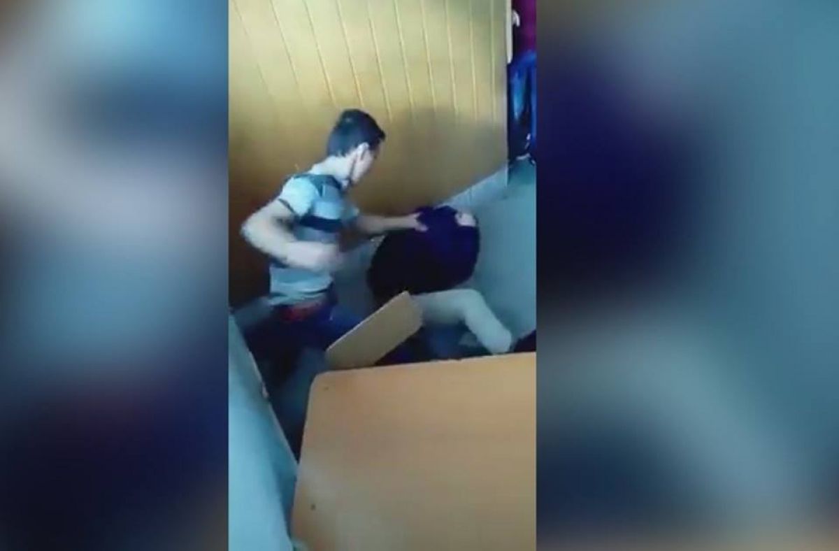 Din senin, agresorul se năpustește cu o ploaie de pumni. Năucit, tânărul cu geacă pică la pământ, dar elevul în tricou continuă să lovească violent.