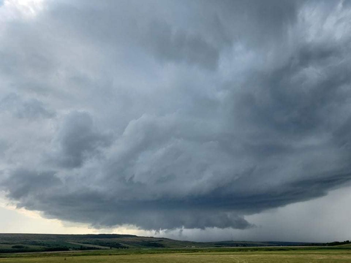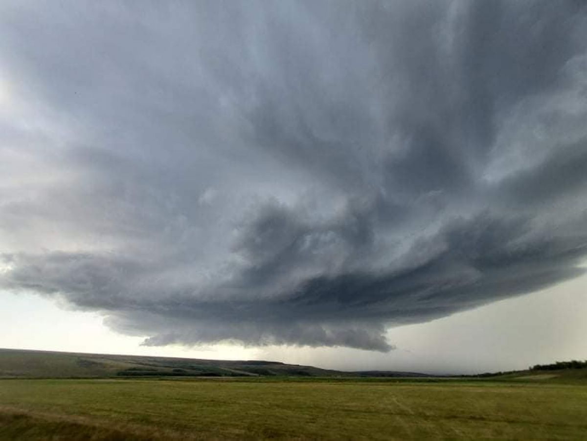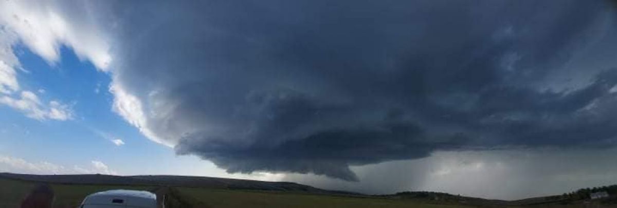 ”În imagine, ceea ce ne atrage foarte mult atenția este prezența bazei foarte joase a supercelulei, chiar cu apariția unui wall cloud, o anexă a sistemului noros rezultată din condensarea umezelii conținută în fluxul ce practic alimentează furtuna. În fața sistemului, perdeaua de ploaie și grindină, ce reprezintă curentul descendent al celulei”,