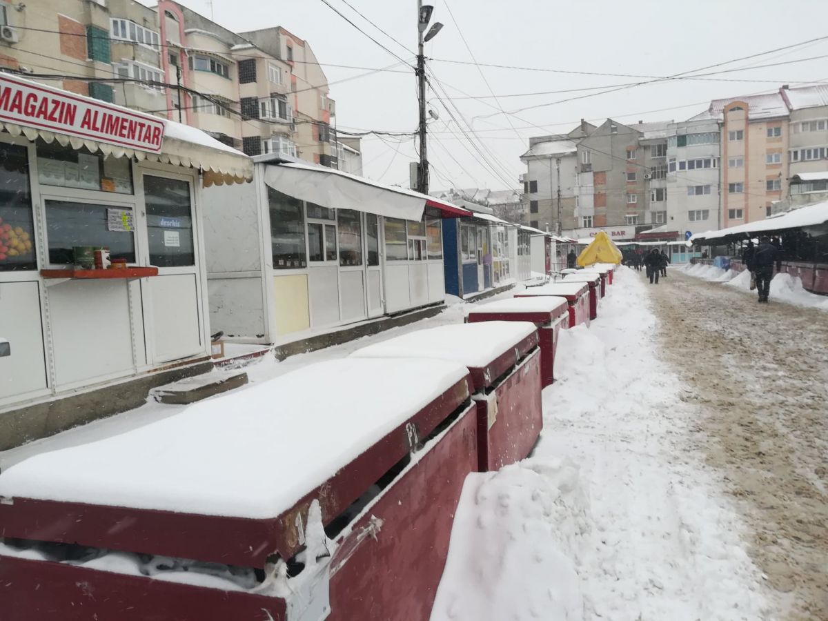 Vremea de afară se pare că i-a speriat și pe comercianți. Majoritatea tarabelor erau goale în Piața Centrală din municipiul reședință de județ. Foarte puțini au îndrăznit să-și scoată marfa afară, în ninsoare. În ciuda acestui fapt, încă de la primele ore ale dimineții zeci de persoane colindau piața.