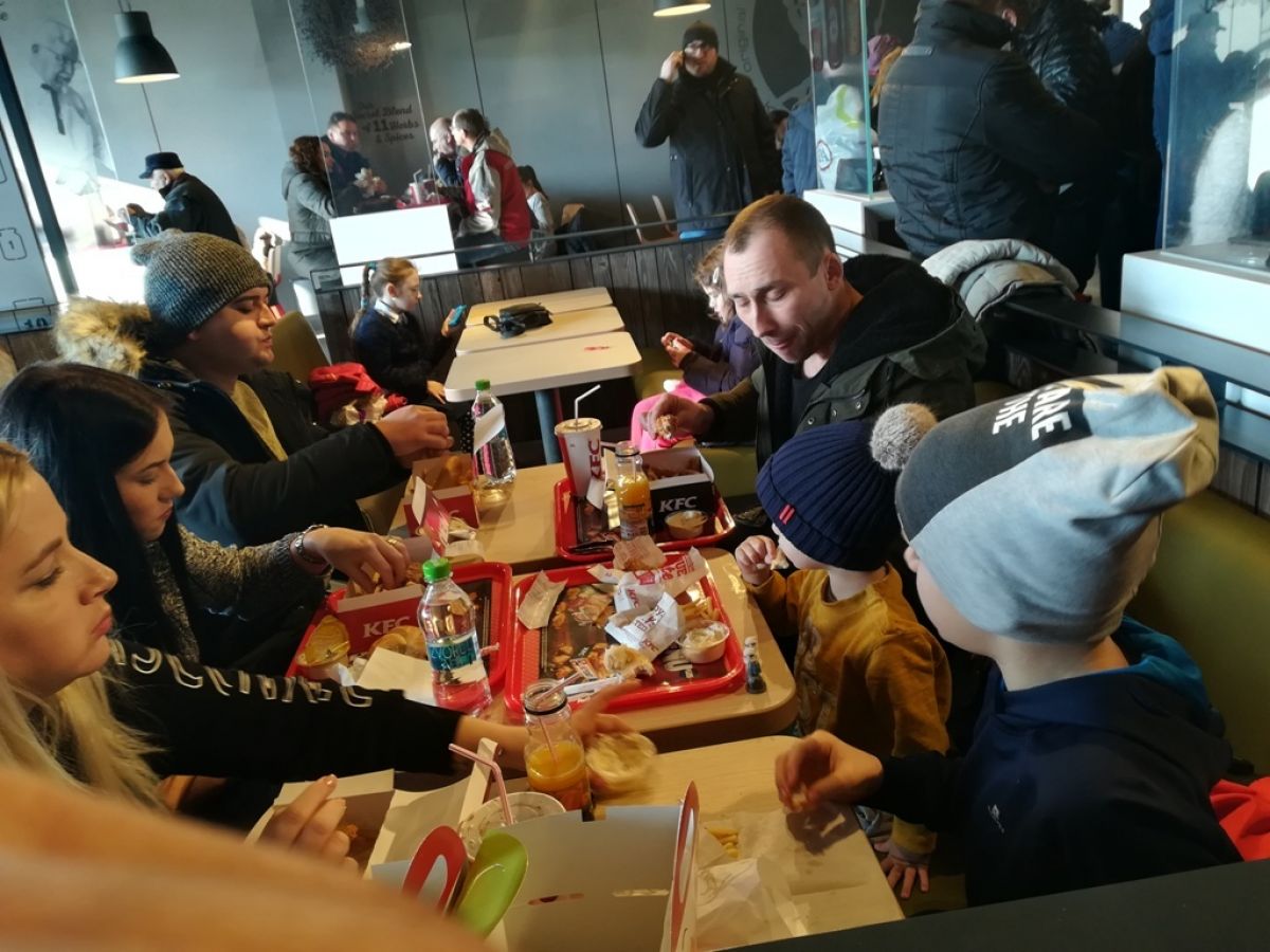 La amiază absolut toate locurile erau ocupate. Alţi doritori ai meniurilor concepute cu decenii bune în urmă de colonelul Sanders aşteptau prin parcare, orice loc eliberat fiind practic vânat, în câteva secunde găsindu-şi un "stăpân".