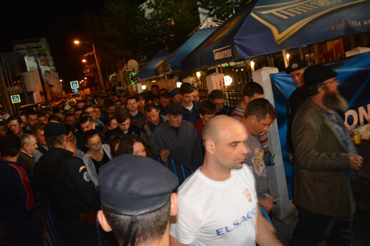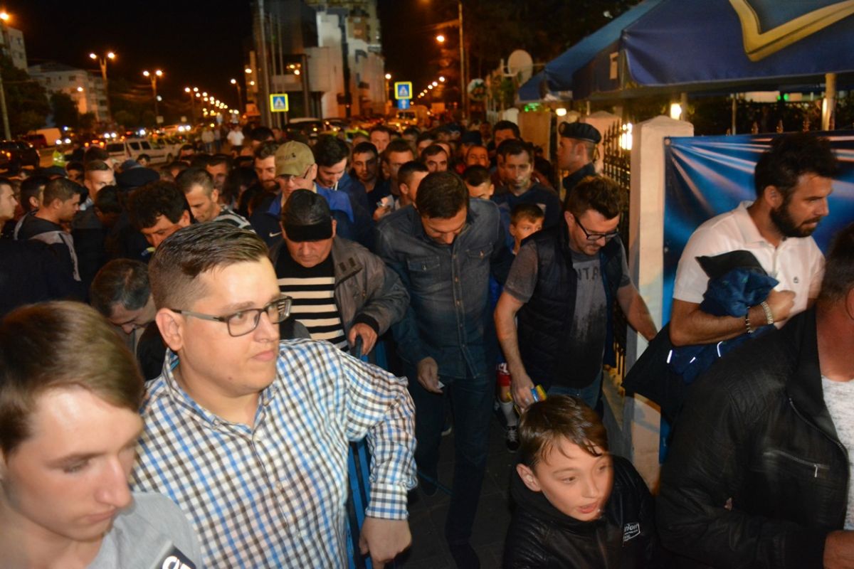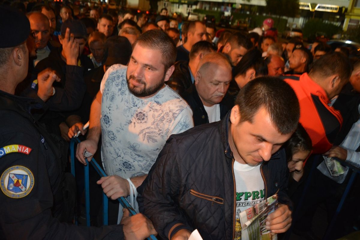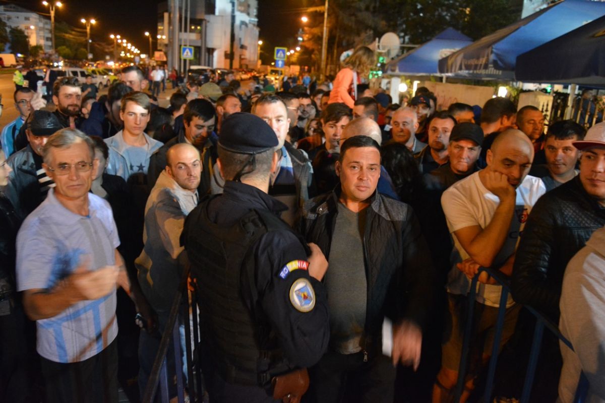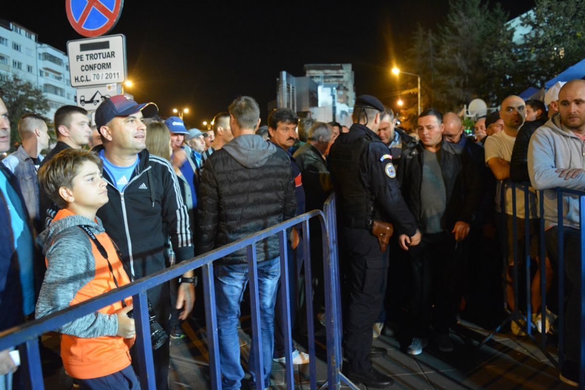 Aceasta și ca urmare a strategiei jandarmilor, care au decis din nou ca intrarea să se facă pe serii de 20 – 25 persoane deoarece la porțile cu turnicheți se adunaseră prea mulți oameni. Nervoși, unii spectatori au început să protesteze, nemulțumiți fiind că, deși au biletele, nu li se dă voie să intre pe stadion. Printre aceștia și Lucian Trufin, venit cu un copil la meci. Primarul de Vlăsinești le-a reproșat jandarmilor: ”când am fost la Barcelona nu m-a mai controlat nimeni”. Când oamenii în uniformă de la Bacău permiteau din nou intrarea, suporterii se împingeau, se loveau de garduri, se călcau la propriu pe picioare pentru ca nu cumva să piardă respectiva serie și să fie nevoiți să aștepte din nou.