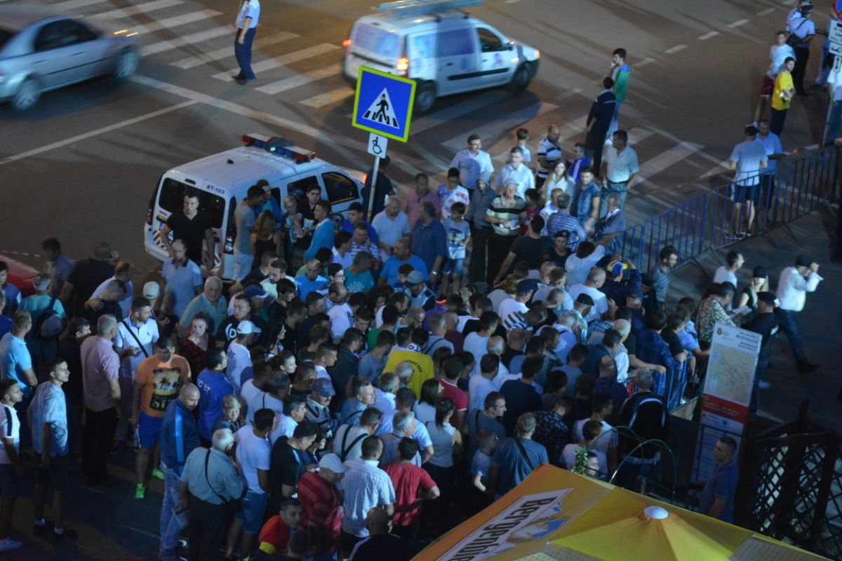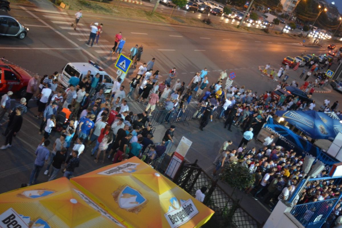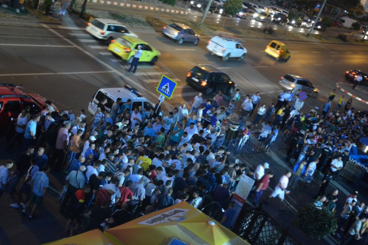 În jur de 500 de oameni se aflau la intrarea principală în arenă cu jumătate de oră înainte de fluierul de start. Responsabile de îmbulzeală erau într-o anumită măsură şi forţele de ordine. Astfel, deşi jandarmii controlau corporal şi în genţi toţi spectatorii, după ce treceau de ei microbiştii ajungeau pe mâna stewarzilor, care făceau exact acelaşi lucru, spre stupefacţia unor suporteri.