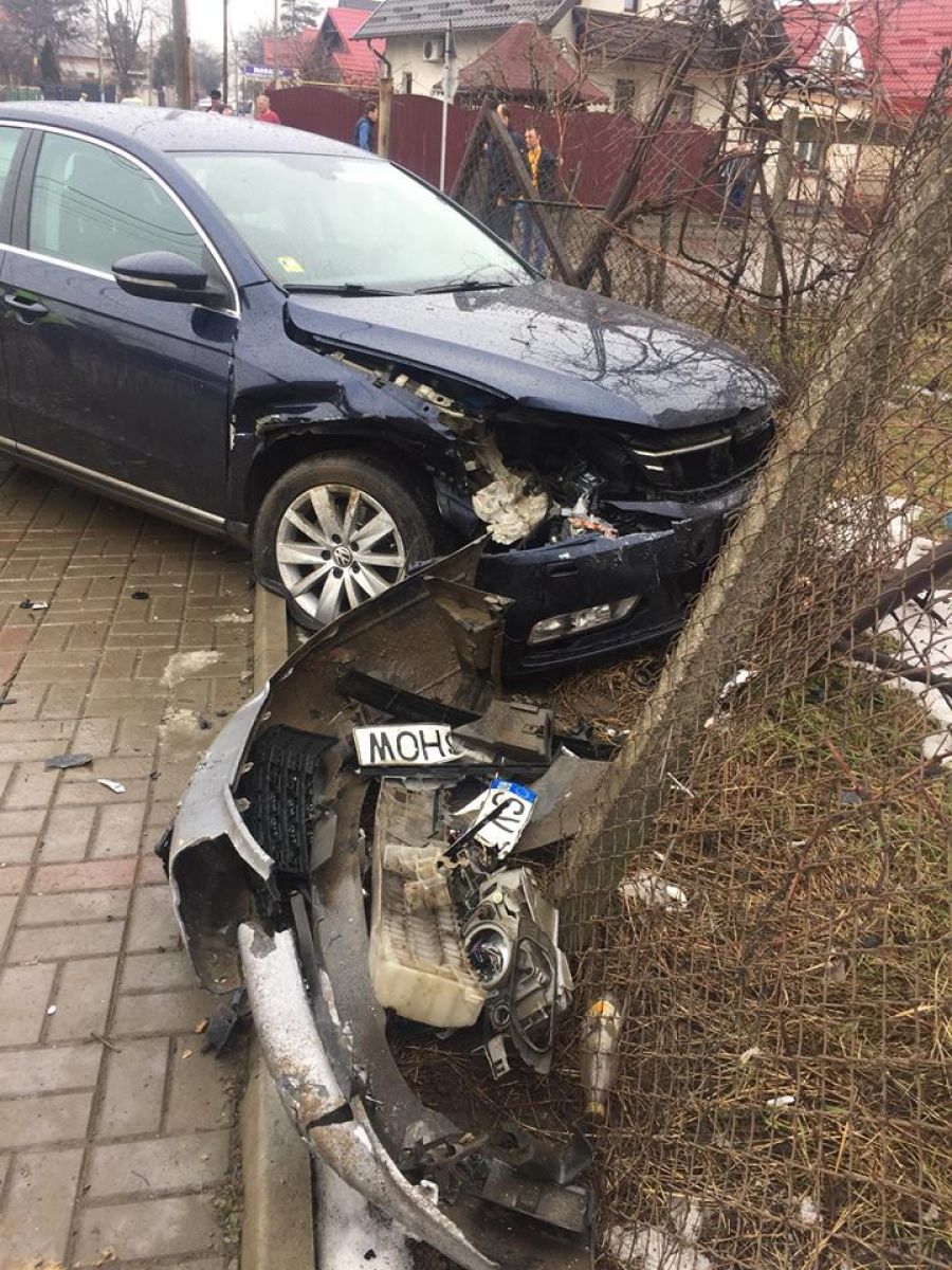 Impactul a fost unul violent. VW-ul a părăsit carosabilul, s-a urcat pe un trotuar și s-a oprit într-un gard, avariindu-și serios partea din față, în timp ce autoturismul Daewoo, cu motorul împins spre bord, a rămas în mijlocul străzii.