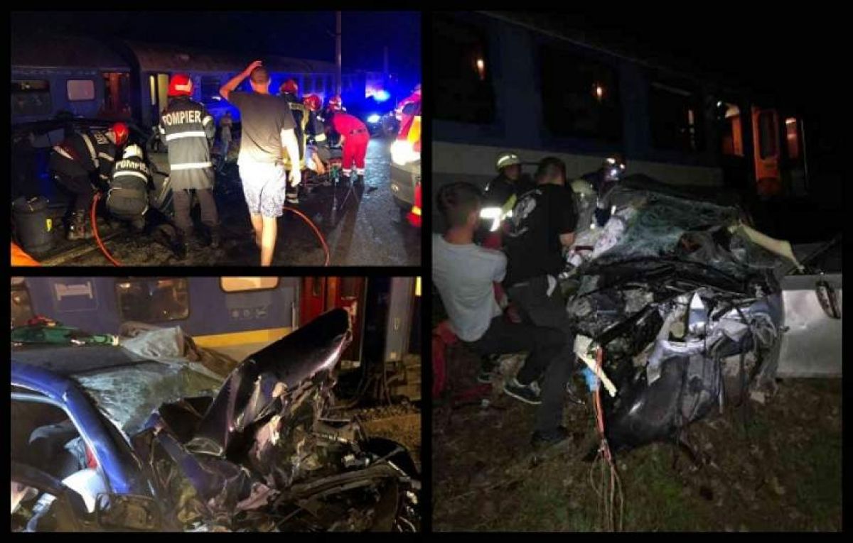 Un autoturism în care se aflau doi tineri de 22, respectiv 23 de ani, a ajuns pe contrasens şi s-a lovit frontal cu un autoturism în care se aflau doi soţi. Impactul a fost atât de puternic, încât maşina tinerilor a fost aruncată pe calea ferată. La nici două minute, locomotiva trenului personal Iaşi-Timişoara o lovit-o în plin.