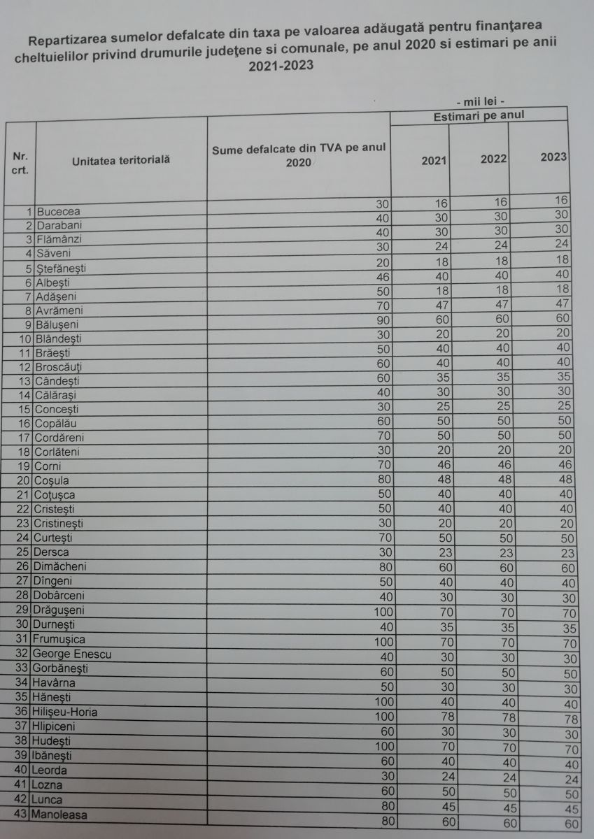 Din partea PNL beneficiază de câte 100.000 de lei doar comunele Hănești și Mihai Eminescu. Restul primarilor liberali au parte de sume precum: 40.000 (Ștefănești), 10.000 (Darbani) sau 60.000 de lei (Mihăileni).