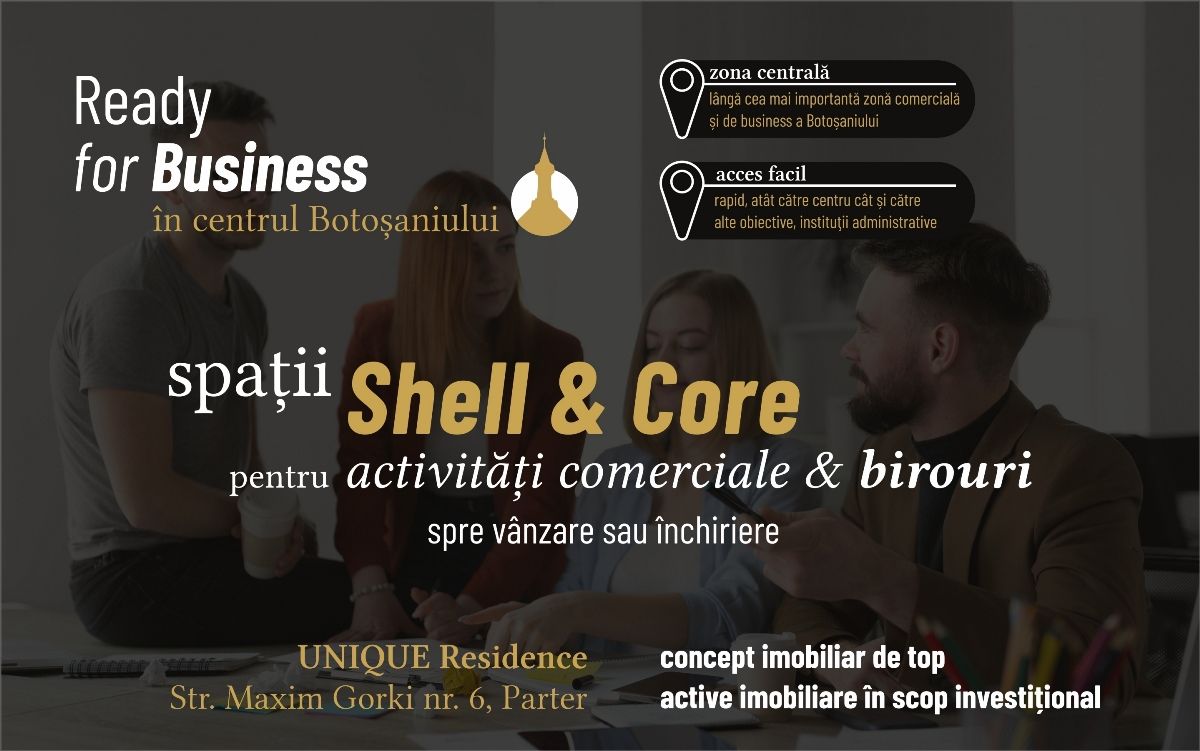 UNIQUE Residence pune la dispoziție și spații Shell & Core pentru activități comerciale și birouri, spre vânzare sau închiriere, în zona centrală a Botoșaniului - ansamblul din Aleea Maxim Gorki nr. 6, zona Biserica Sfântul Dumitru.