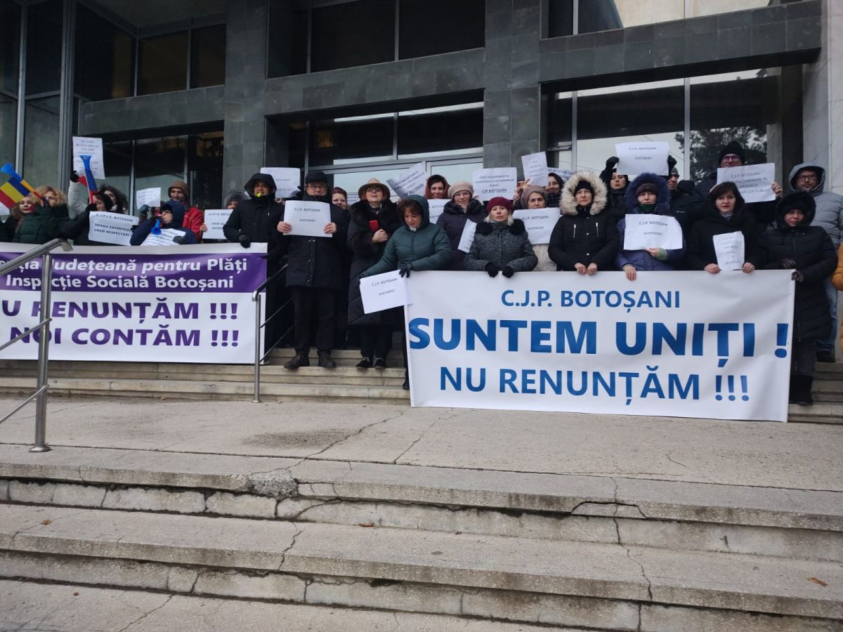 La acest moment salariații din toată țara, inclusiv de la Botoșani, din Casa Județeană de Pensii, Agenția Județeană de Prestații și Inspecție Socială precum și Agenția Județeană pentru Ocuparea Forței de Muncă au ieșit în stradă.