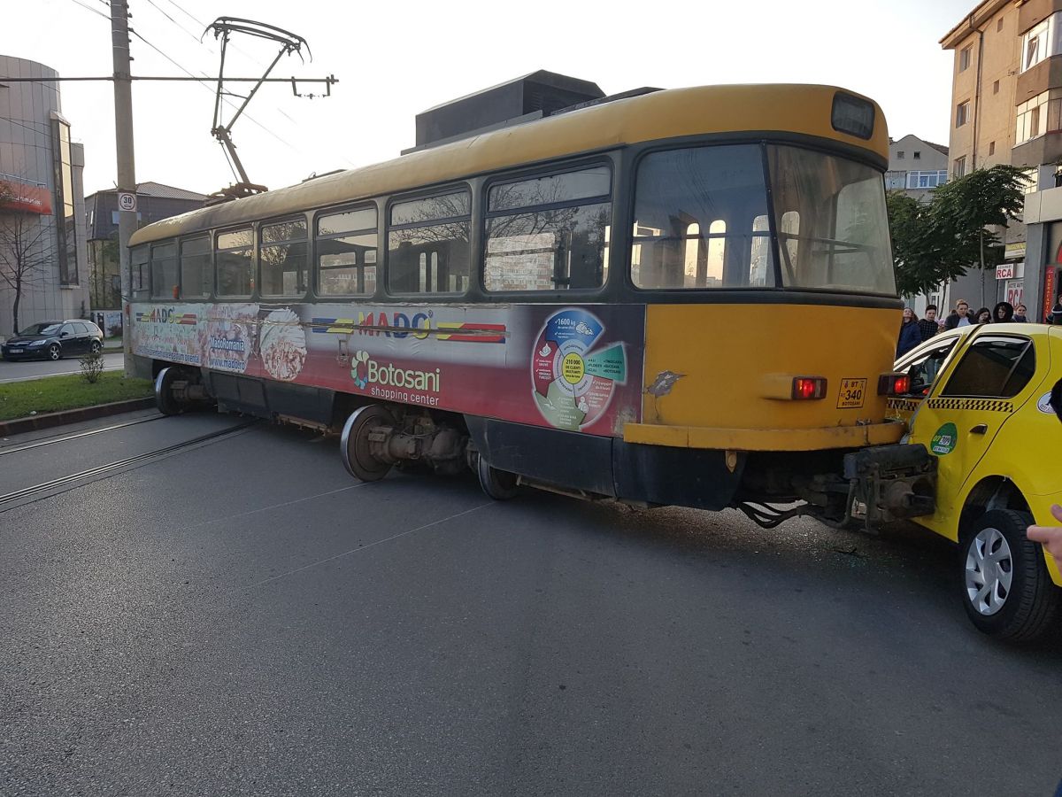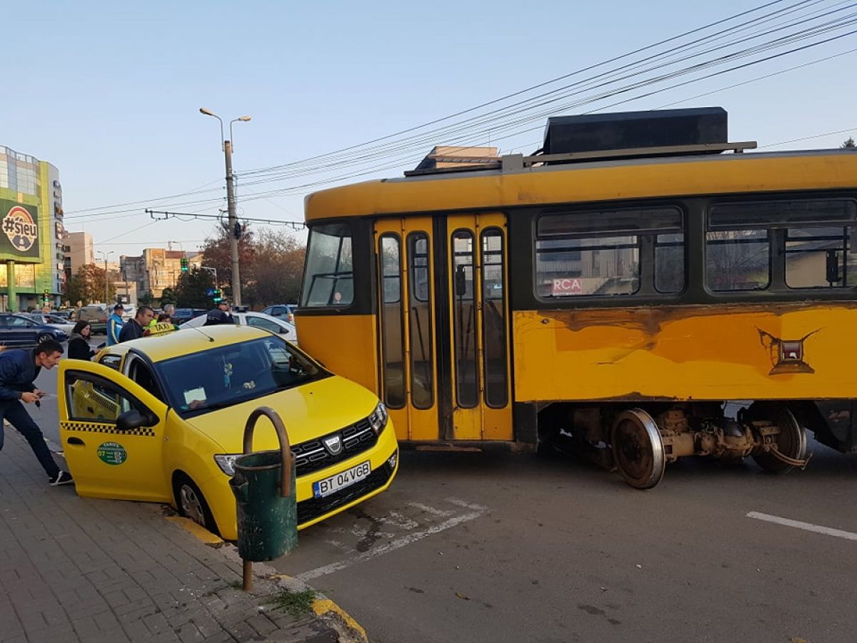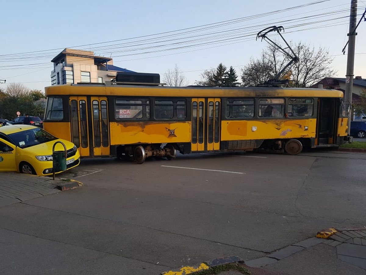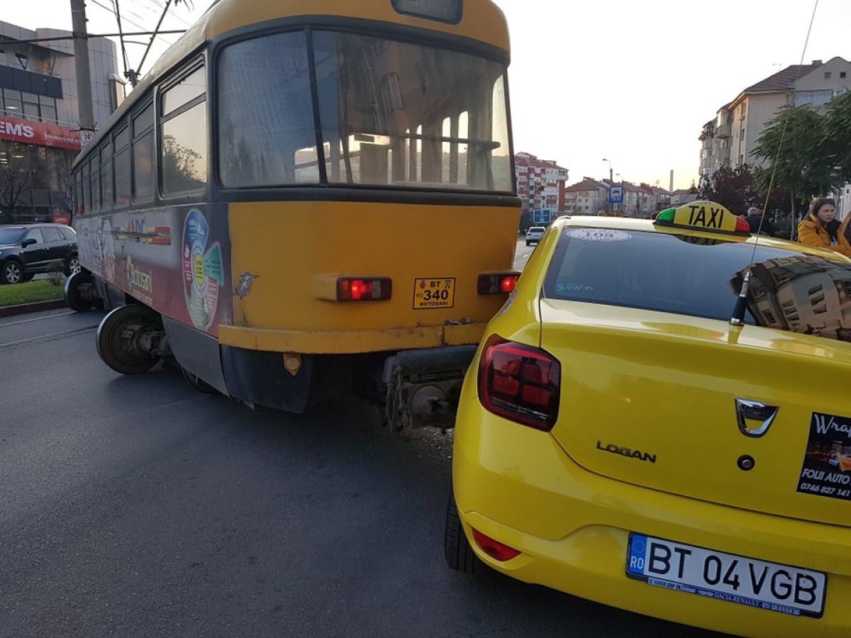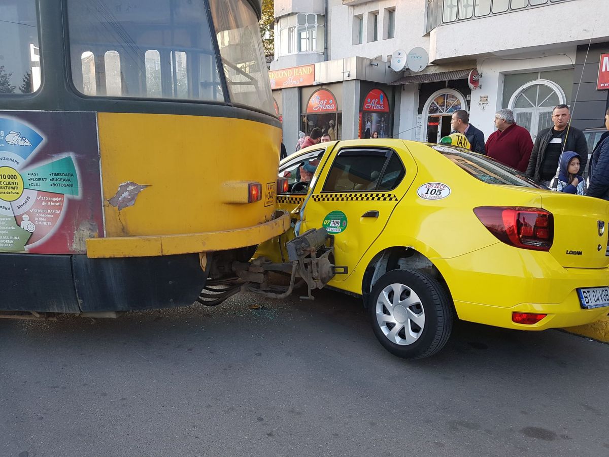 Un taximetru a fost avariat în urmă cu puțin timp de către un tramvai care a sărit de pe șine, iar partea din spate a lovit efectiv autoturismul marca Dacia Logan.